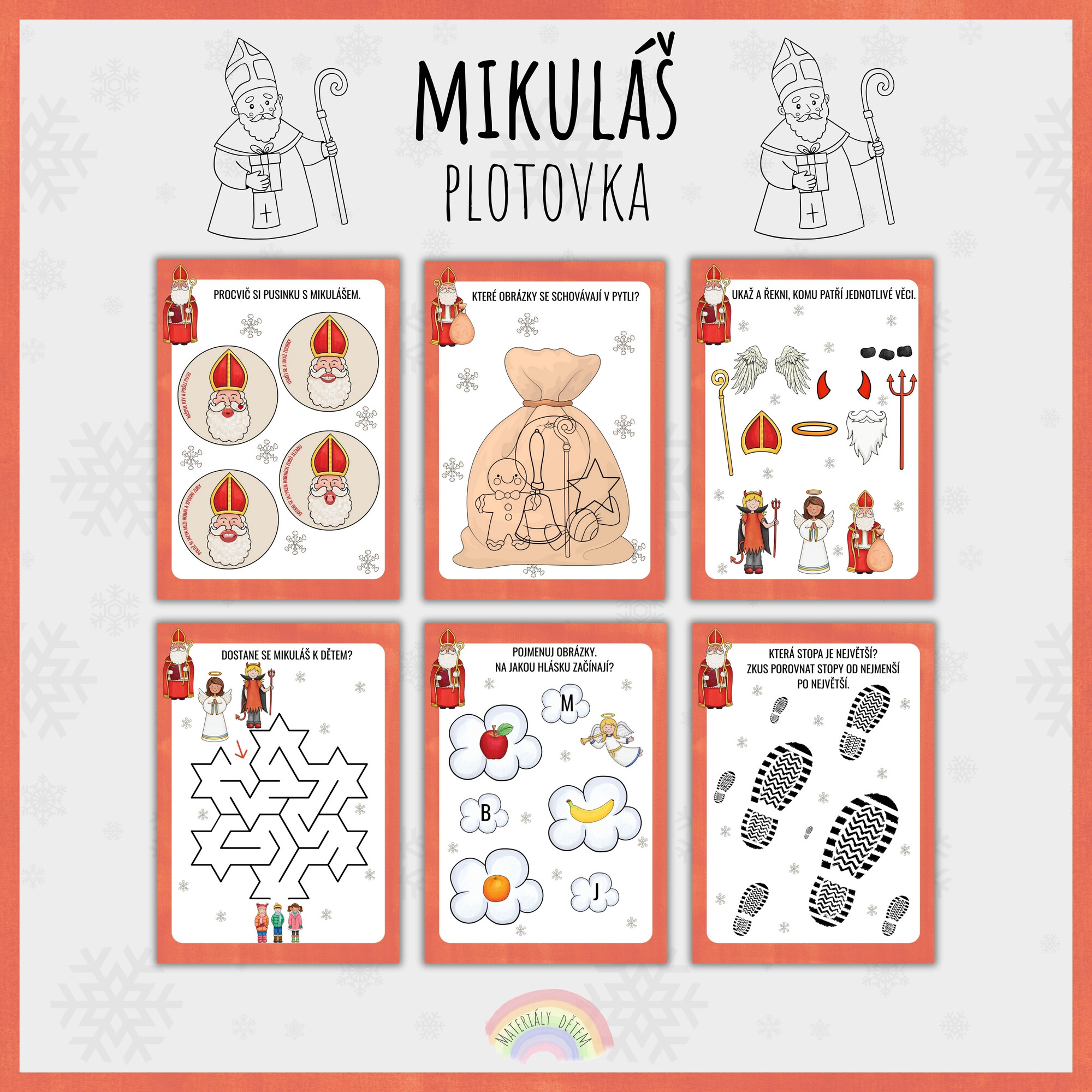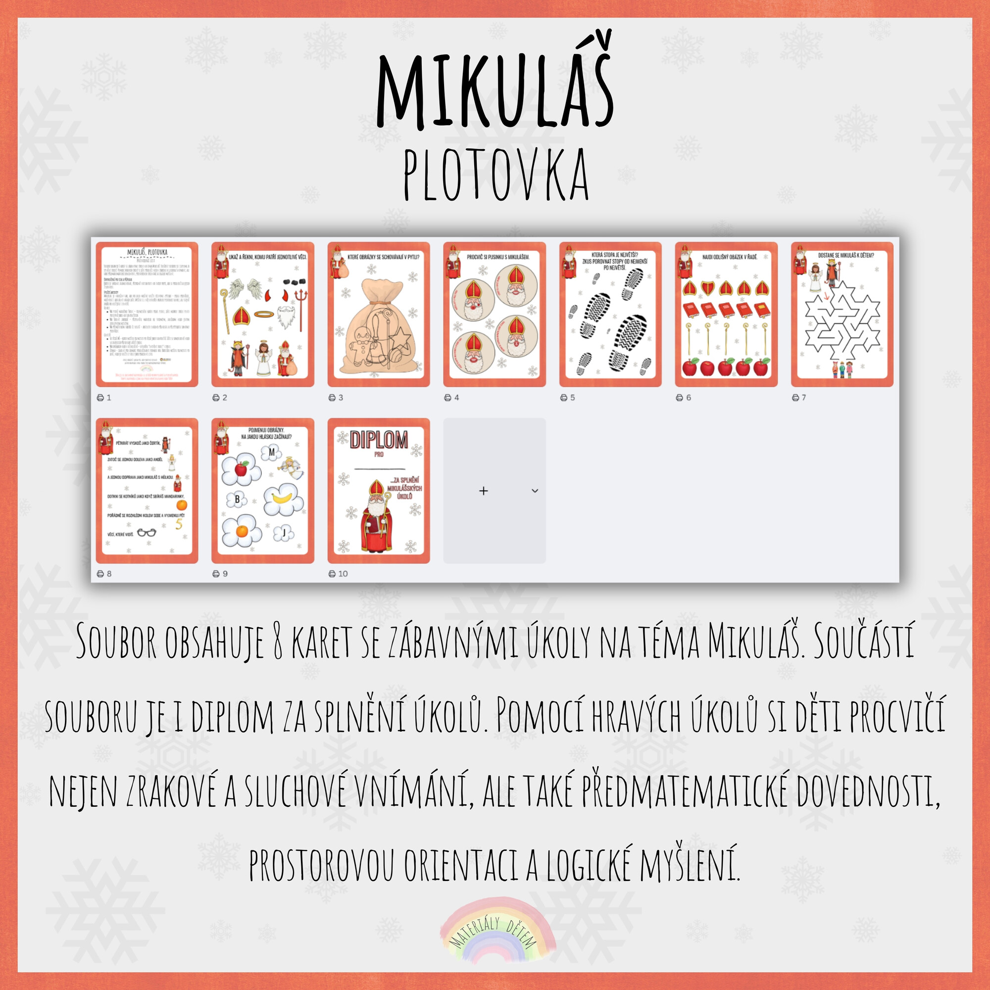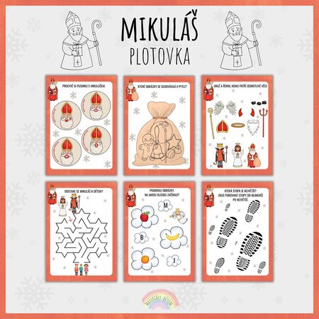 Soubor obsahuje 8 karet se zábavnými úkoly na téma Mikuláš. Součástí souboru je i diplom za splnění úkolů. Pomocí hravých úkolů si děti procvičí nejen zrakové a sluchové vnímání, ale také předmatematické dovednosti, prostorovou orientaci a logické myšlení.