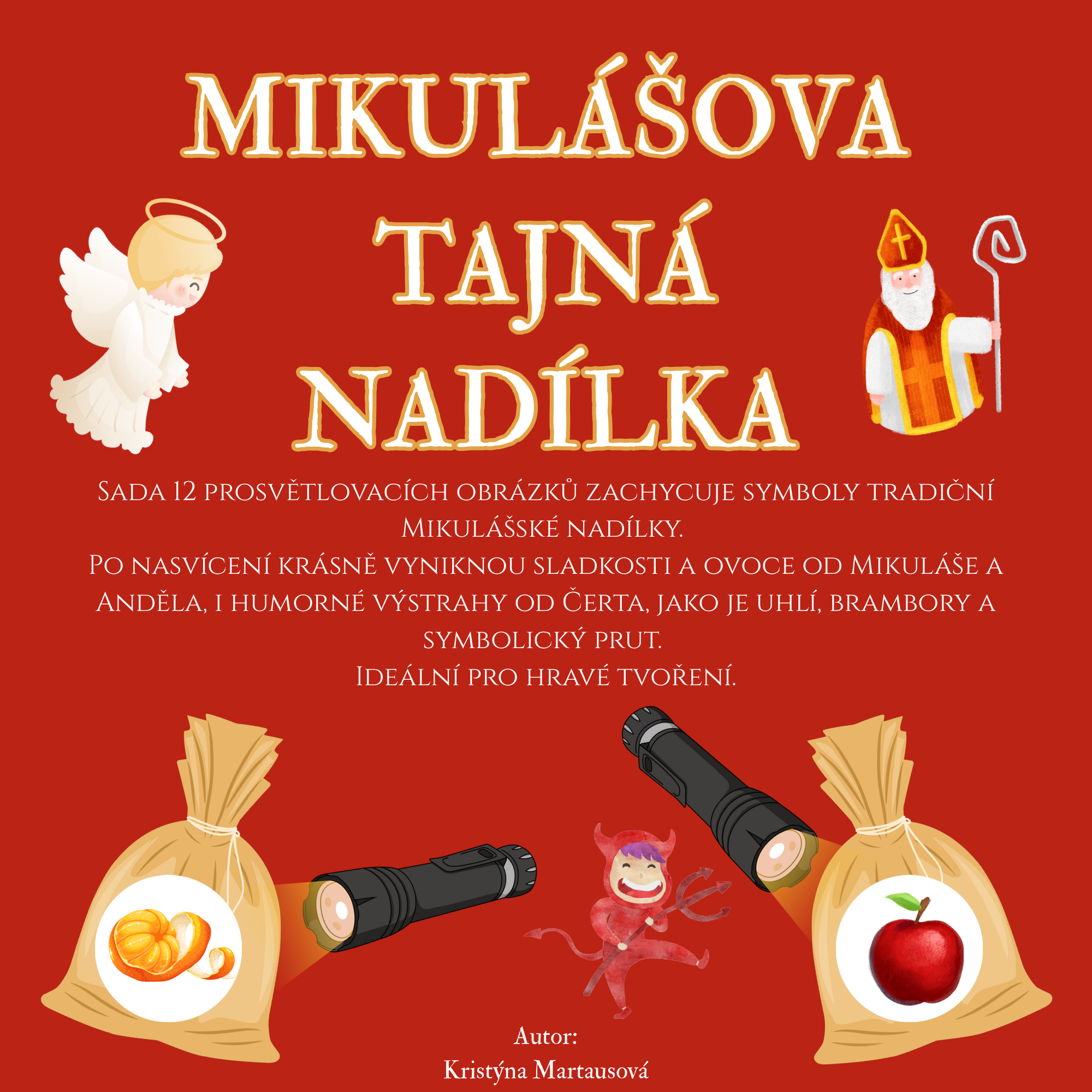 Tato sada 12 prosvětlovacích obrázků přináší kouzelnou atmosféru mikulášské noci a symboly tradiční nadílky. Děti zde najdou jak sladkou odměnu od Mikuláše (např. mandarinky, ořechy, čokoládové mince), tak i humorné varování od Čerta (např. uhlí, bramboru, symbolický prut).
