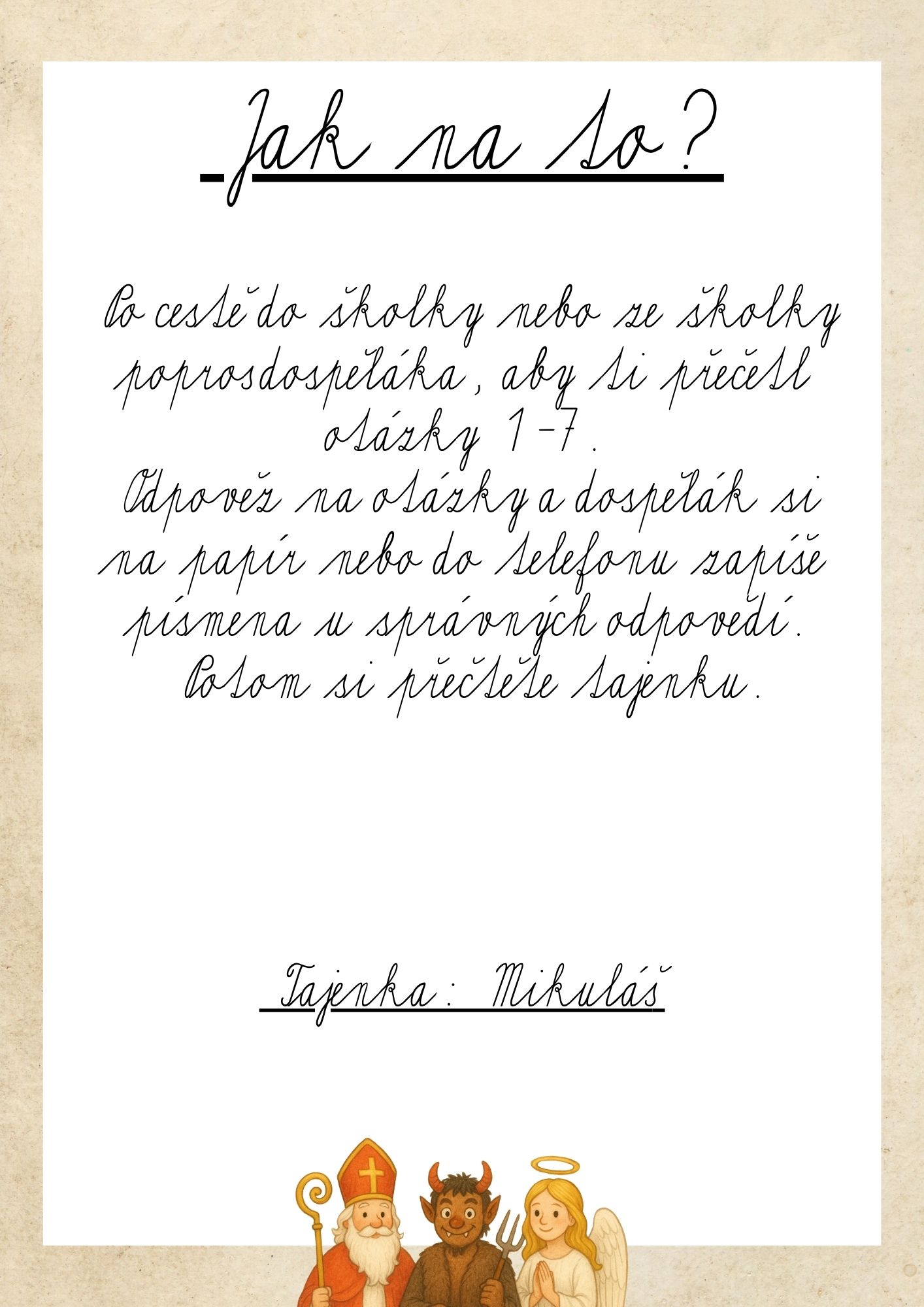Úkolem dětí je správně odpovědět na otázky. Rodiče si zapíší písmena přiřazená ke správným odpovědím a získají tak tajenku.