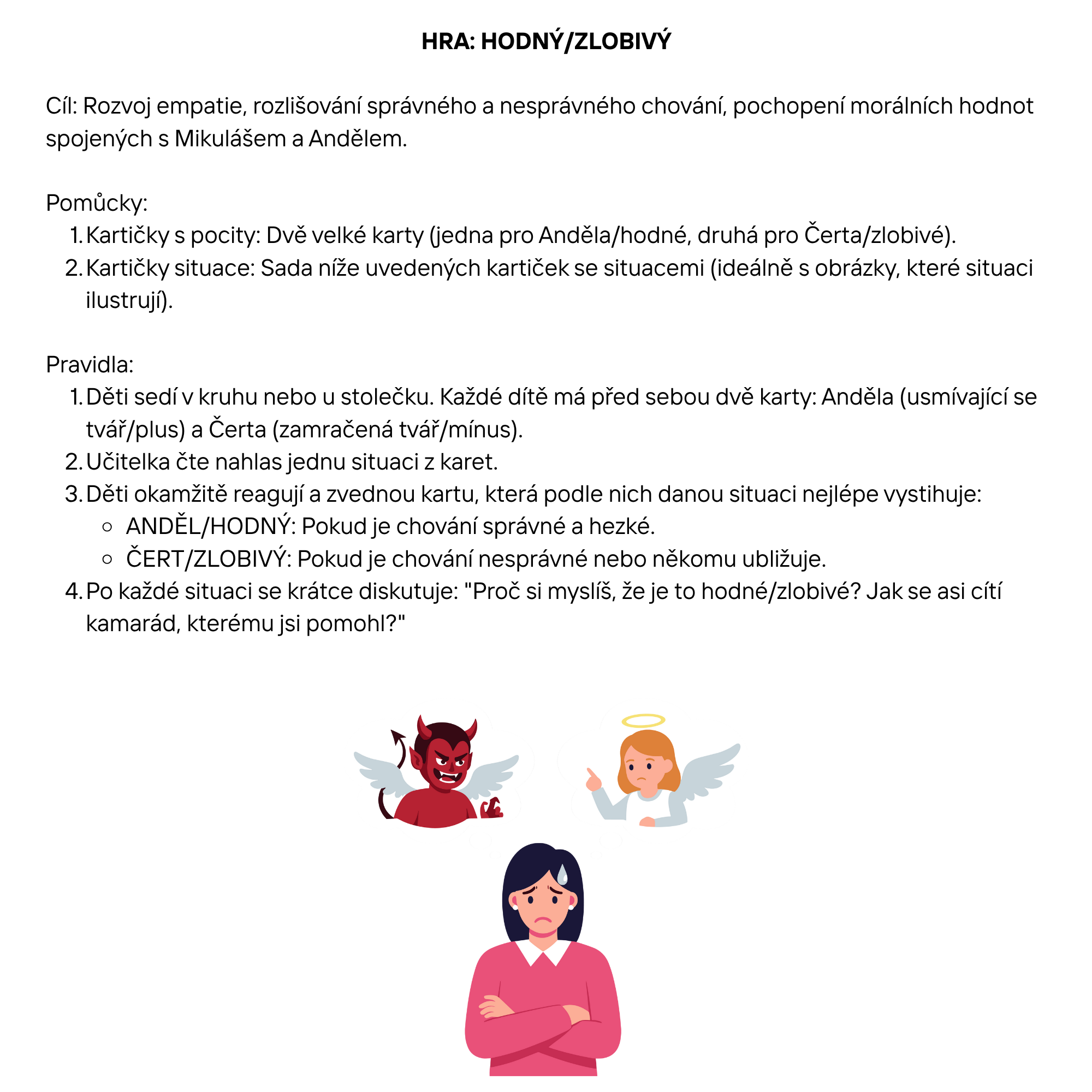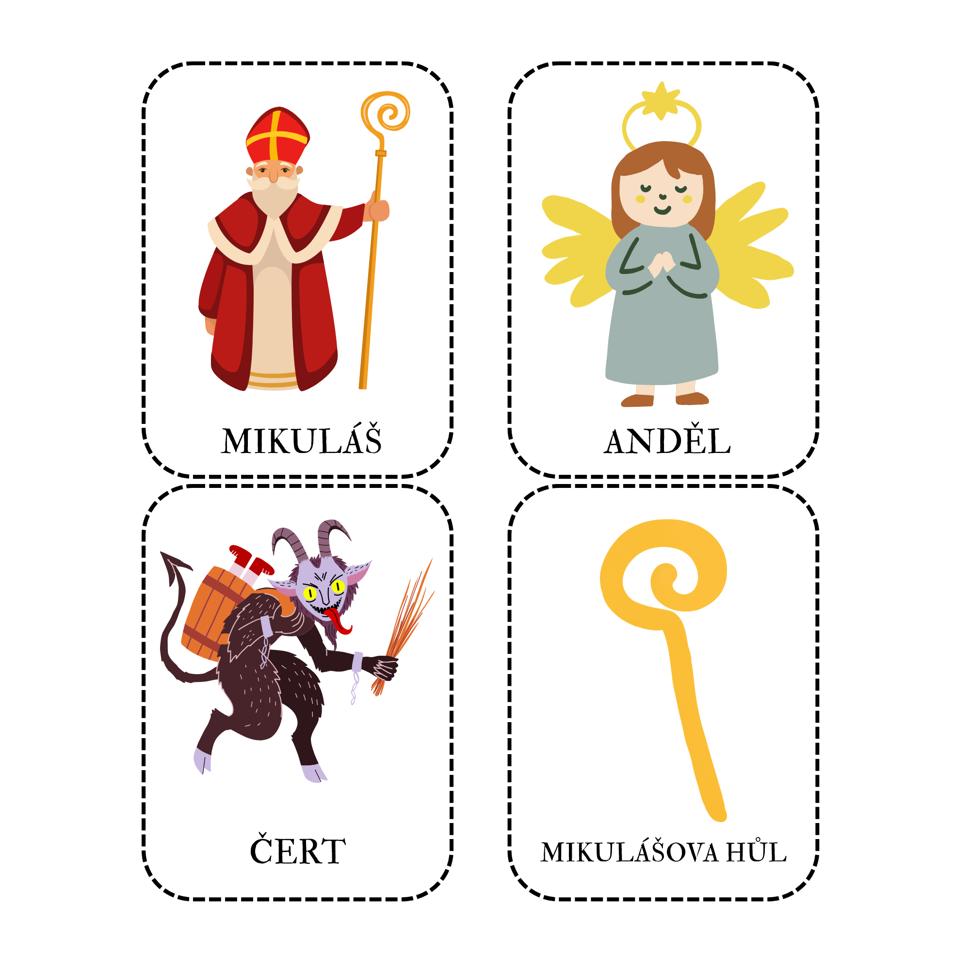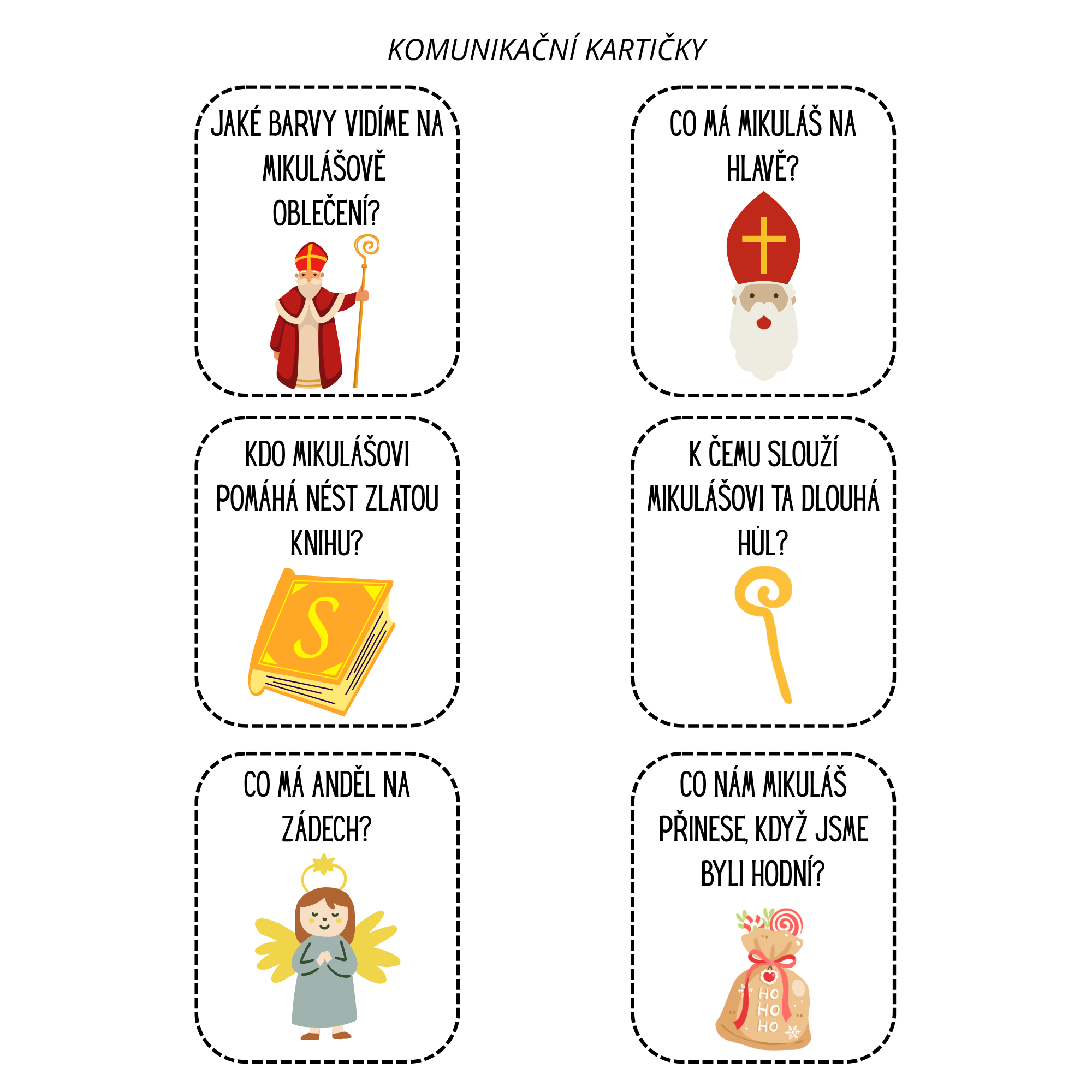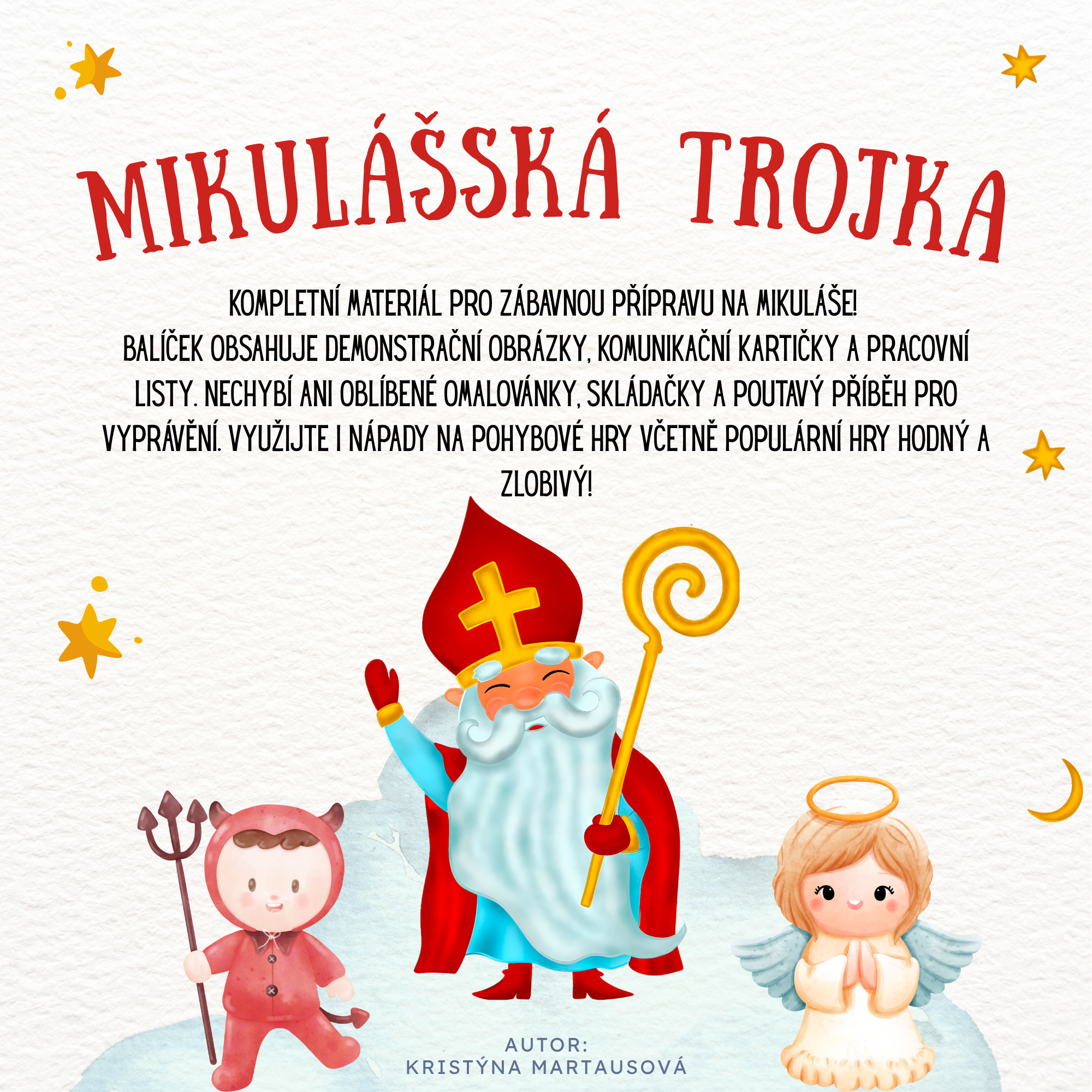 Uvnitř najdete vše potřebné: od přehledných demonstračních obrázků a komunikačních kartiček pro rozvoj slovní zásoby, přes zábavné omalovánky a skládačky pro trénink jemné motoriky, až po poutavý příběh o Mikuláši. Nechybí ani pracovní listy a nápady na pohybové hry, včetně oblíbené aktivity HODNÝ a ZLOBIVÝ, která děti hravě připraví na nadílku.
