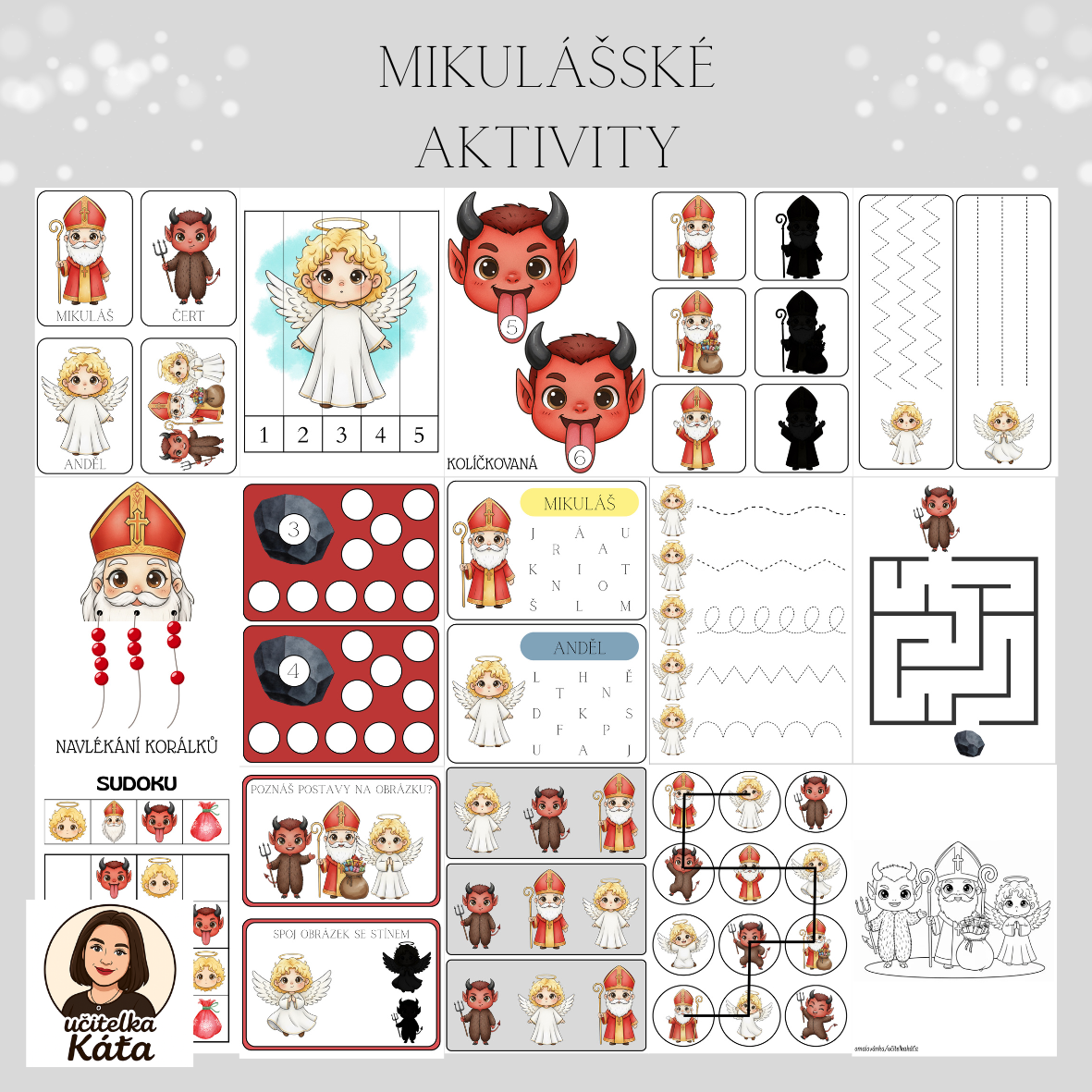 Demonstrační obrázky, skládačky, hledání stínů, kolíčkovaná, předloha ke stříhání, navlékání korálků, předloha k modelování, grafomotorika, bludiště, hledání písmen, sudoku, zraková paměť, ranní úkoly, mikulášské bludiště, omalovánka