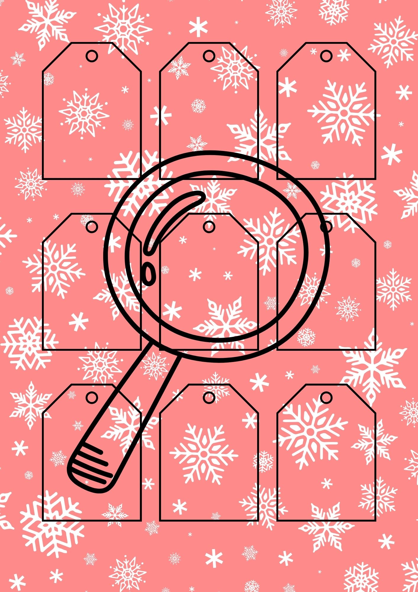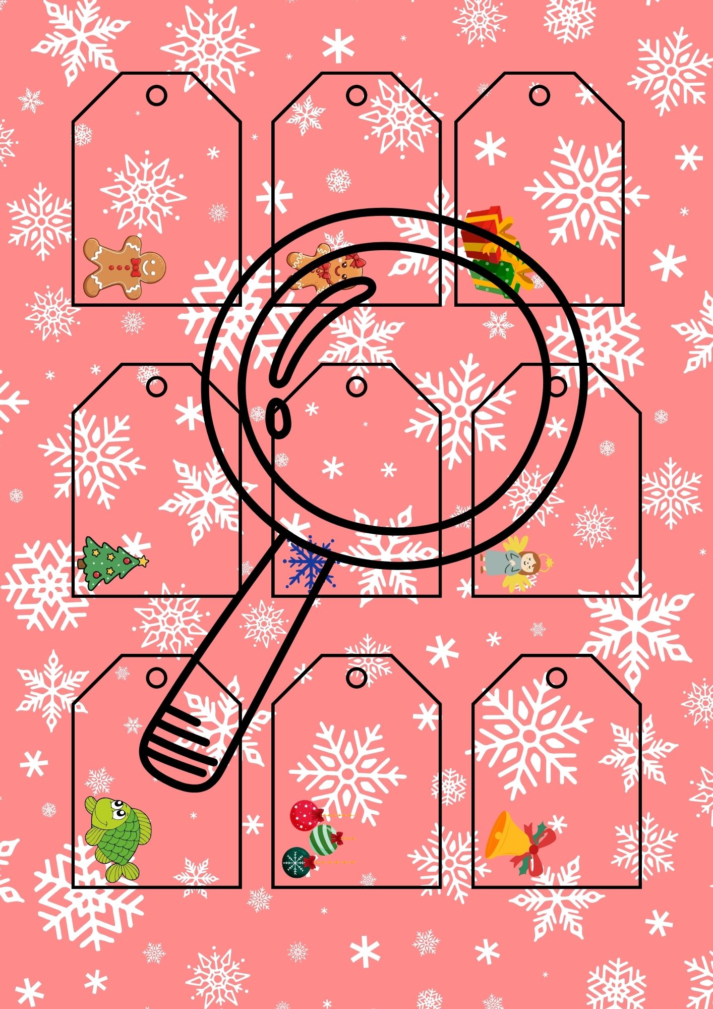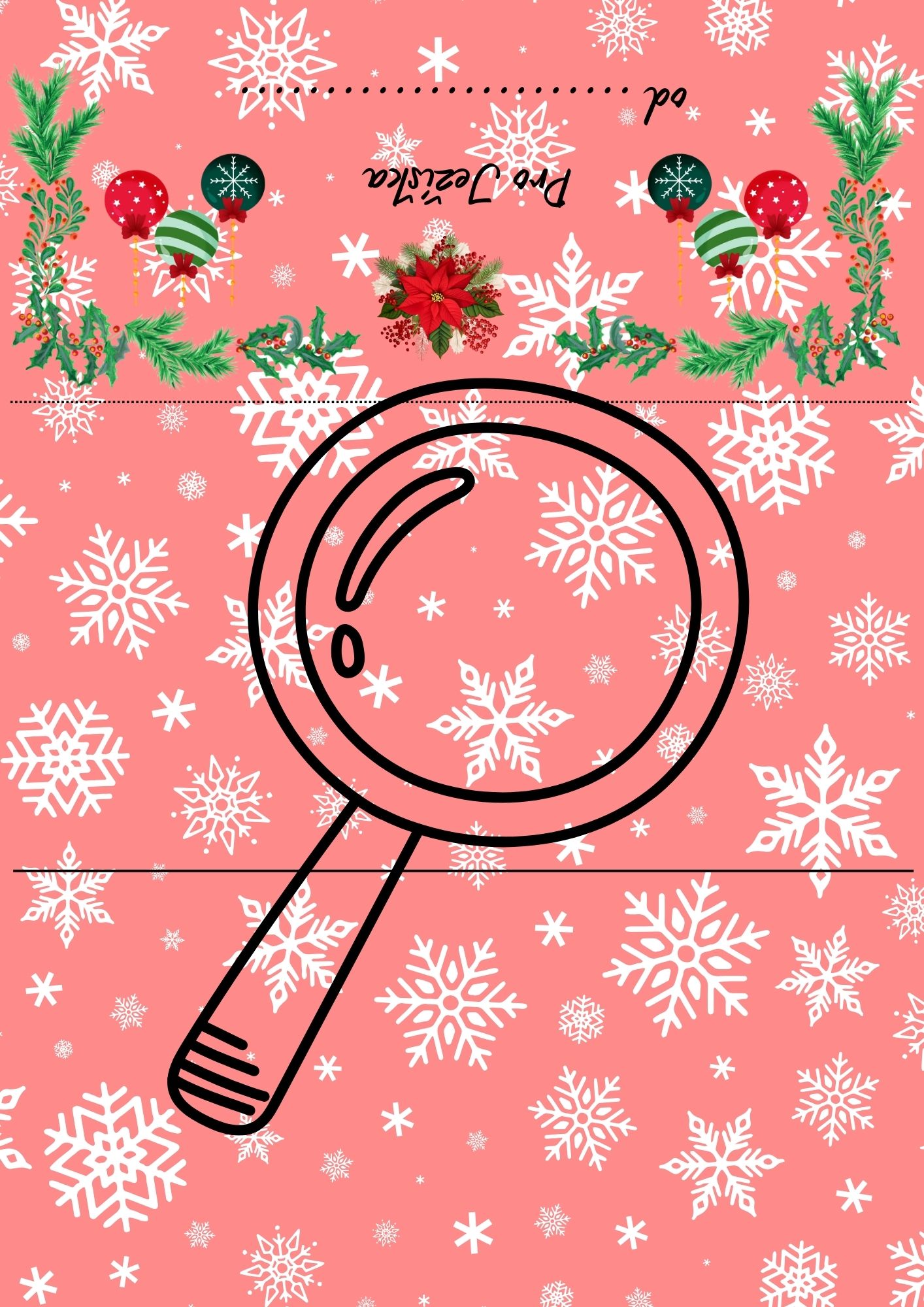 - stránka určená k malování či nalepení obrázků dárků, které si dítě přeje (bílá stránka s lemovaná barevnými okraji a malými vánočními obrázky)