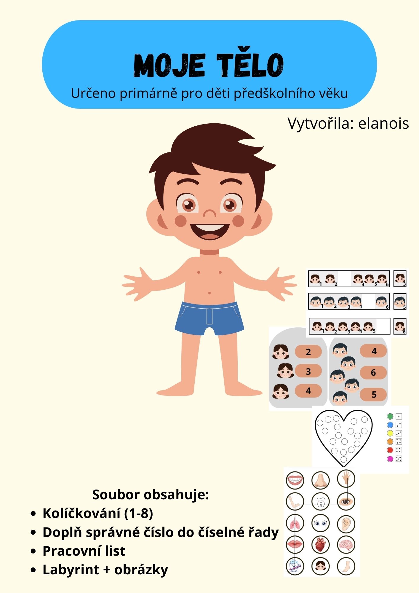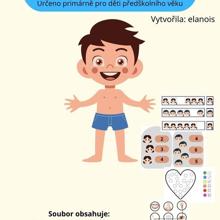 Moje těloUrčeno primárně pro děti předškolního věku.Obsahuje:Kolíčkování (1-8)Doplň správné číslo do číselné řadyPracovní listLabyrint + obrázky
