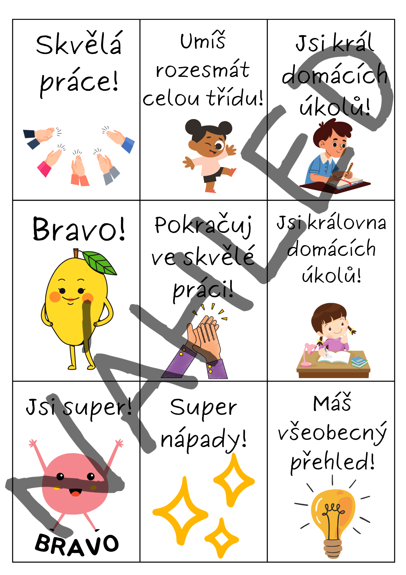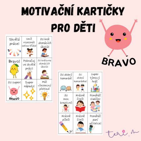 Sada obsahuje 36 originálních kartiček s krátkými pozitivními vzkazy, které podpoří motivaci, sebedůvěru a radost z učení. (verze pro dívky i chlapci, učitele i učitelky)