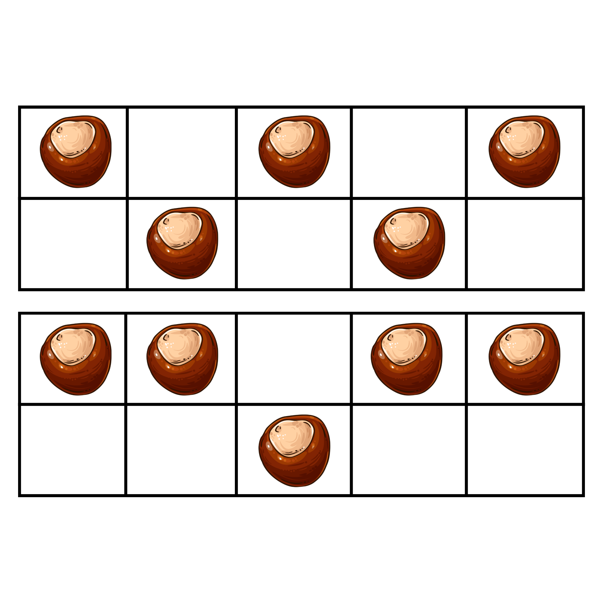 - předlohy pro práci s krabičkou od vajíček – děti podle vzoru ukládají kaštany do správných přihrádek