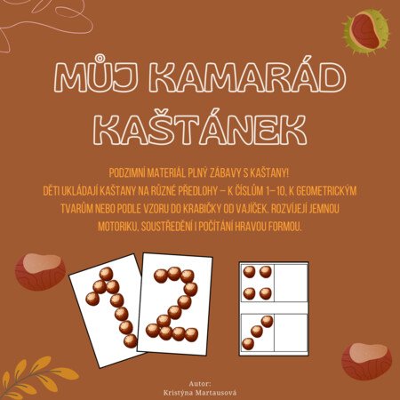 Materiál je zaměřený na rozvoj jemné motoriky, zrakového vnímání, počítání a poznávání tvarů. Děti pracují s reálnými kaštany, které ukládají na různé předlohy – a tak se učí hrou.