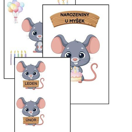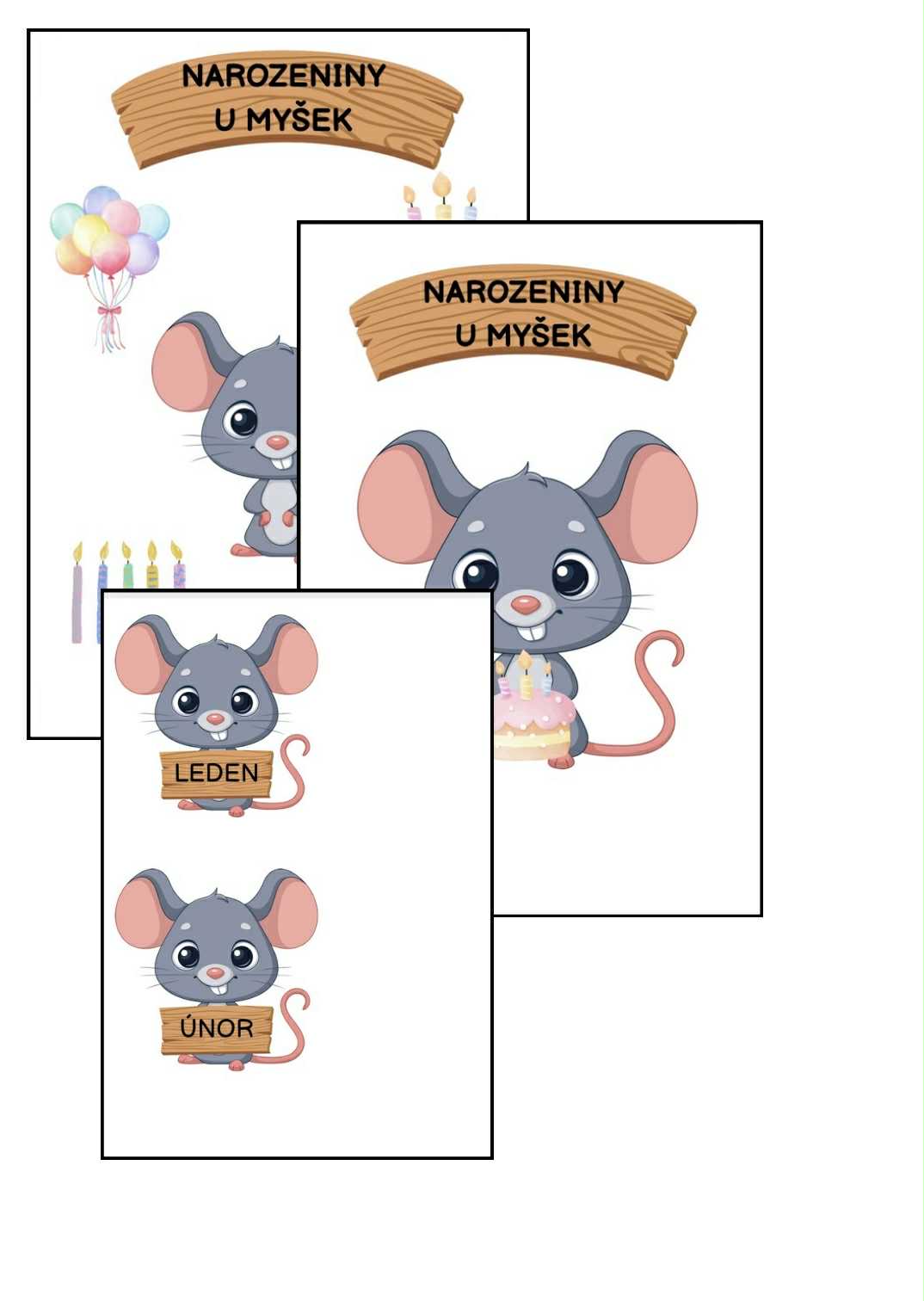 Co najdete v souboru?2x úvodní stránku, kterou si můžete vybrat podle sebeMyšky s měsíciKolečka s myškami, kam dopíšete jméno dítěte + datum narozenin