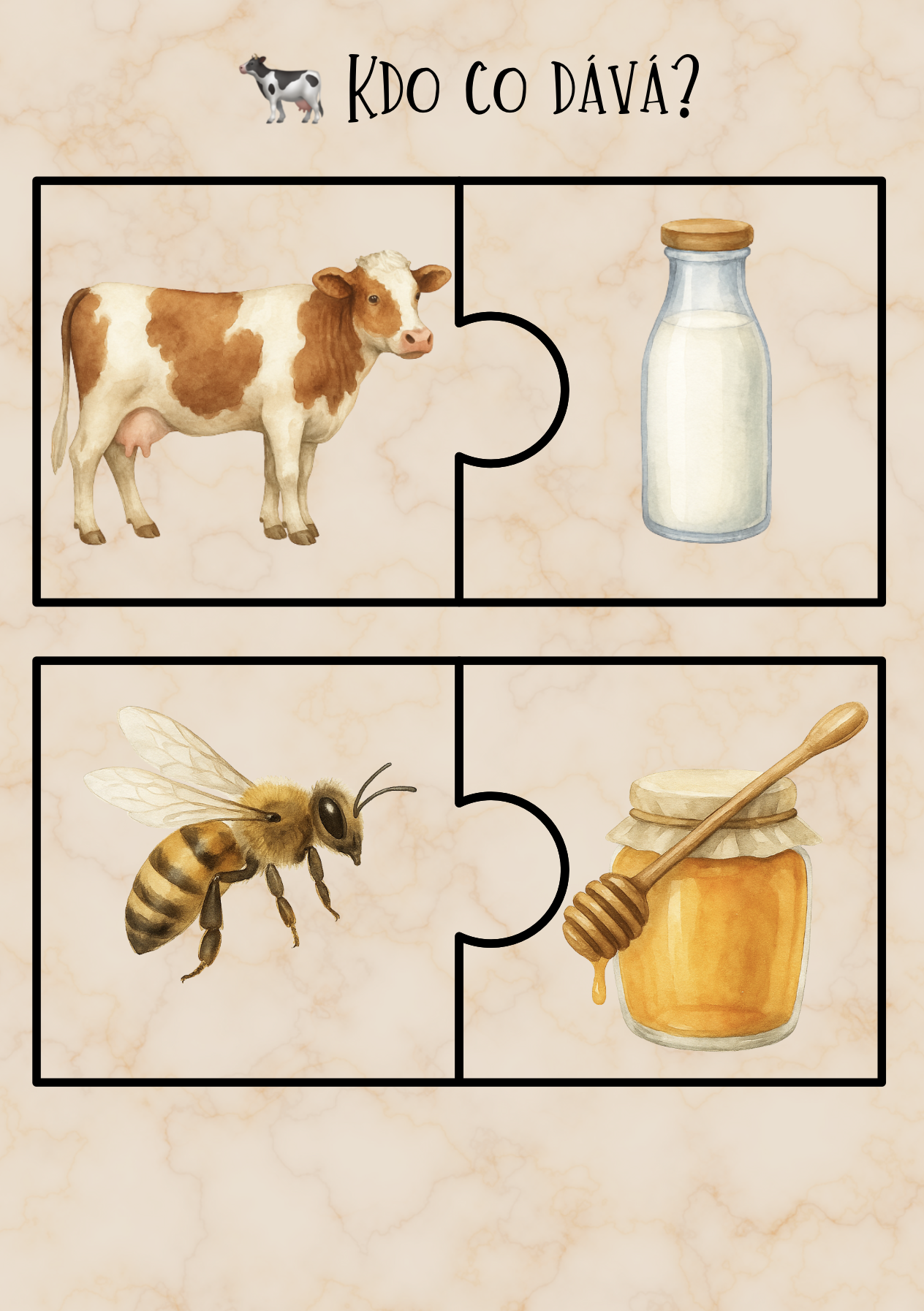 🔹 Kdo co dává (kráva – mléko, včela – med…)