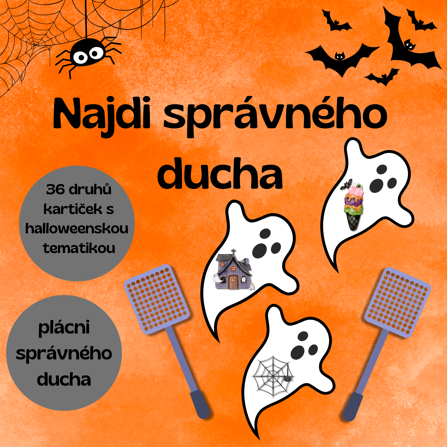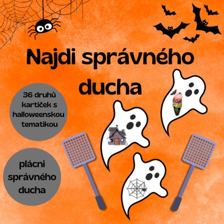 Materiál obsahuje 36 duchů s halloweenskými obrázky a 36 kartiček se stejnými motivy. Učitelka ukáže kartičku a děti mají za úkol najít ducha se stejným obrázkem – ideálně pomocí plácačky se suchým zipem (není součástí).