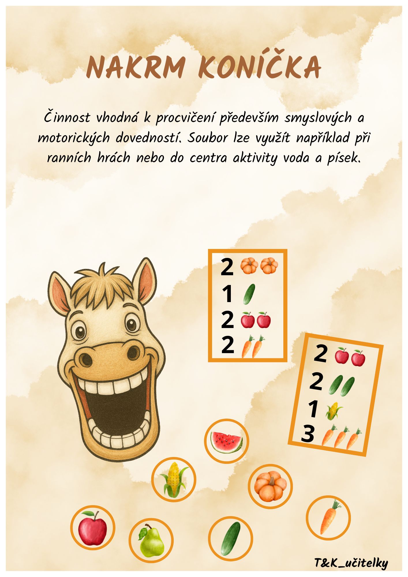 Činnost vhodná k procvičení především smyslových a motorických dovedností. Soubor lze využít například při ranních hrách nebo do centra aktivity voda a písek.