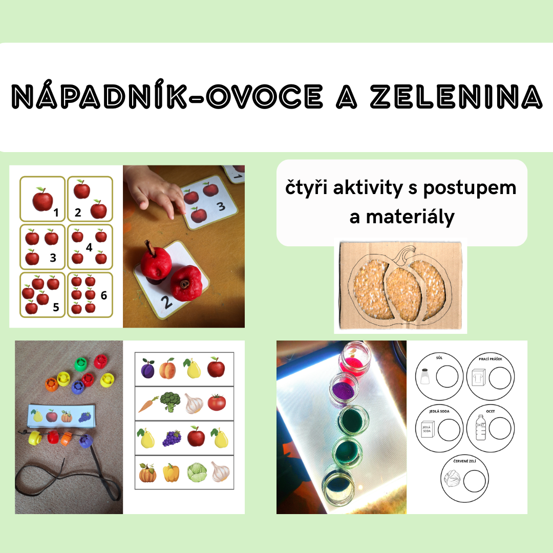 Inspirace pro, možná trošku netradiční, aktivity na téma ovoce a zelenina. Soubor obsahuje postup i materiály k dané aktivitě. Aktivity zahrnují počítání, jemnou motoriku, barvy i pokus k pozorování.