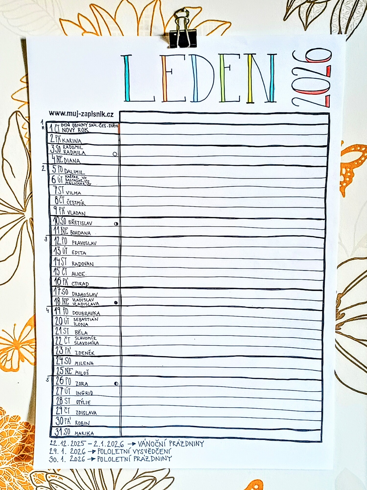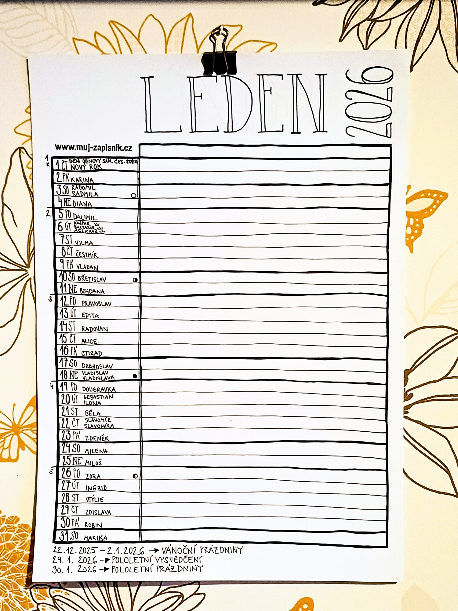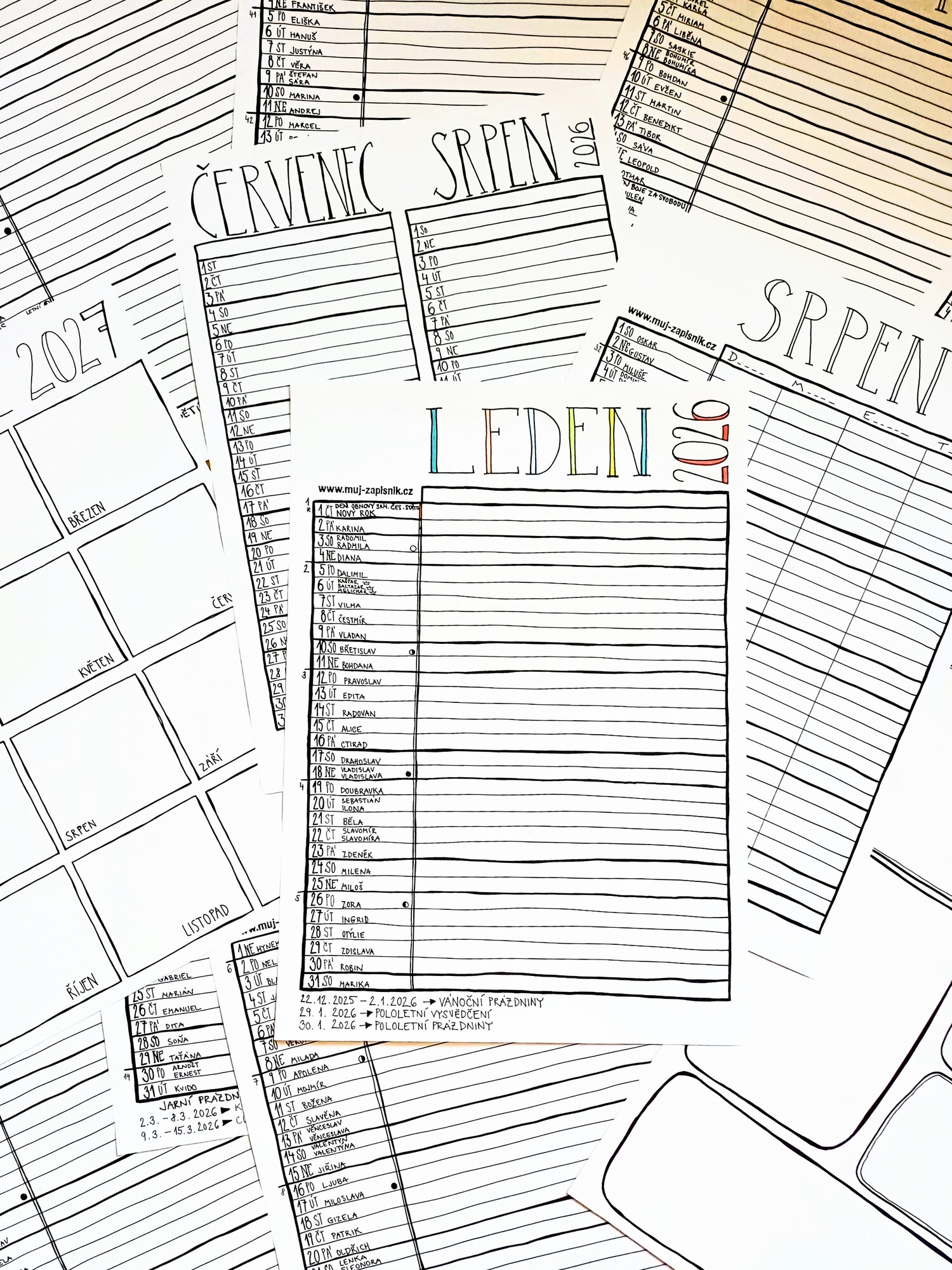 Plánovací kalendář 2026 z dílny Můj zápisník je autorský nástěnný kalendář, který je celý napsaný a nakreslený ručně. Obsahuje důležité informace jako jsou jmenné svátky, státní svátky, školní prázdniny nebo fáze měsíce a poskytne vám spousty prostoru pro zapsání všech důležitých událostí.
