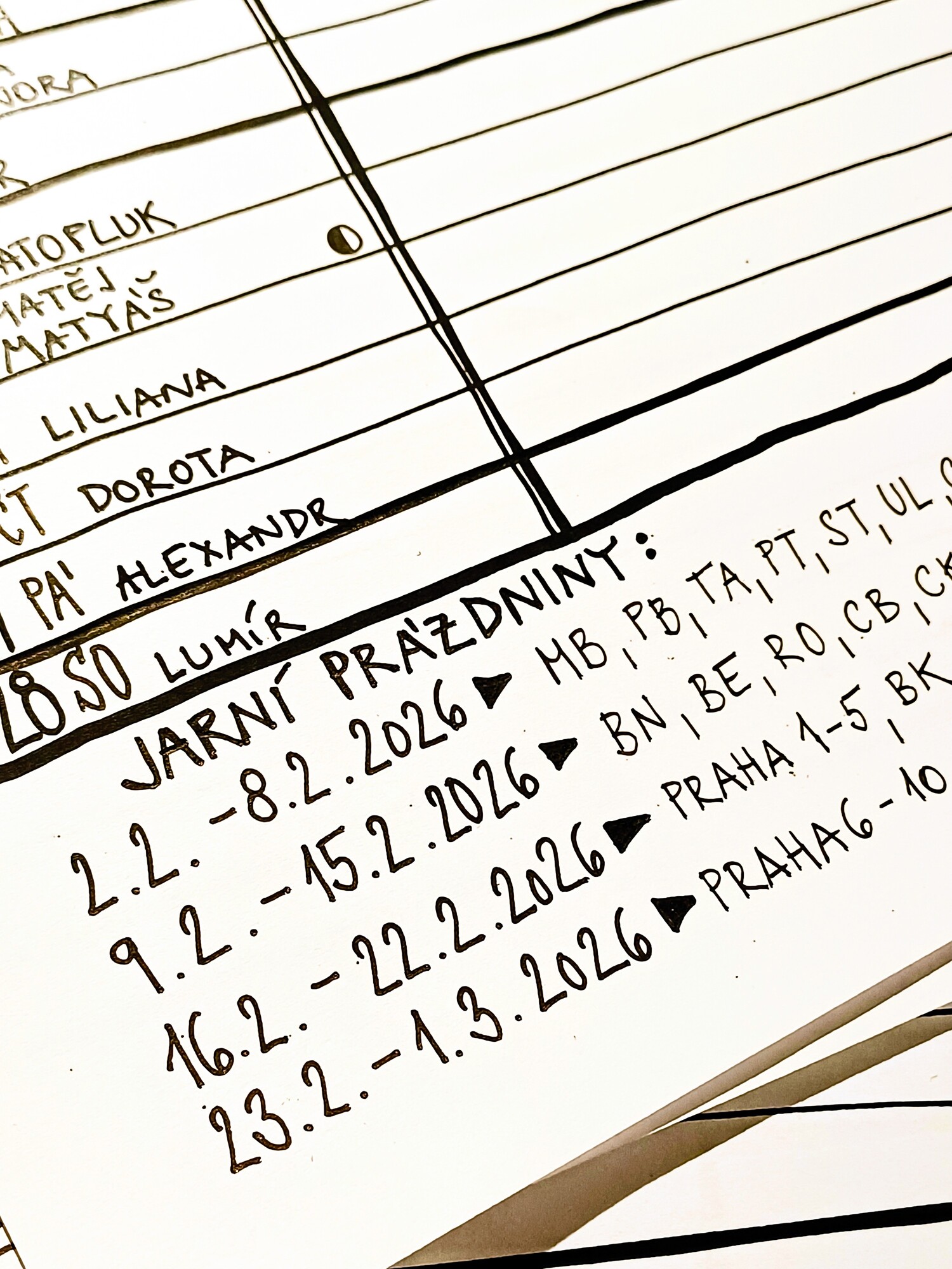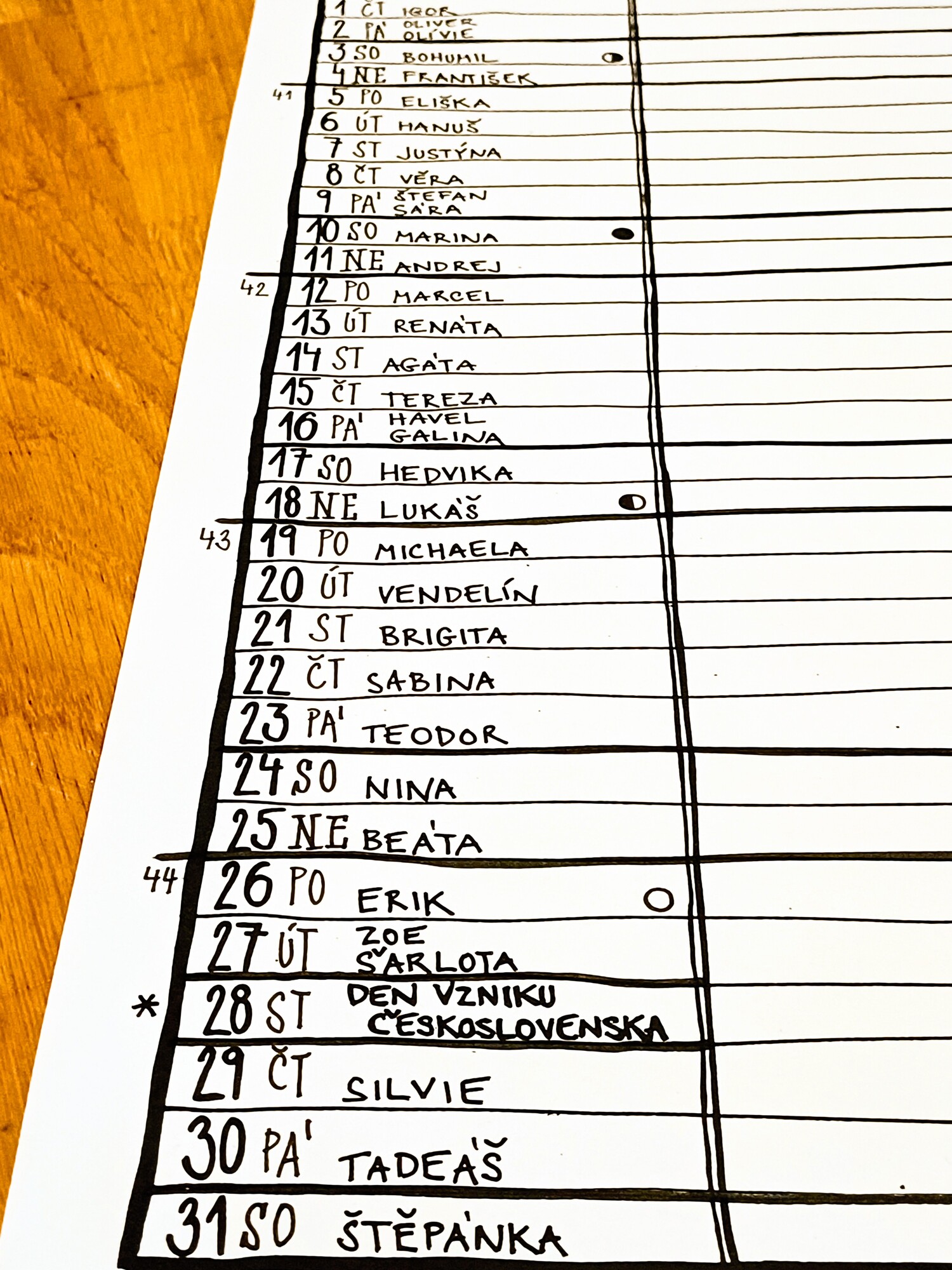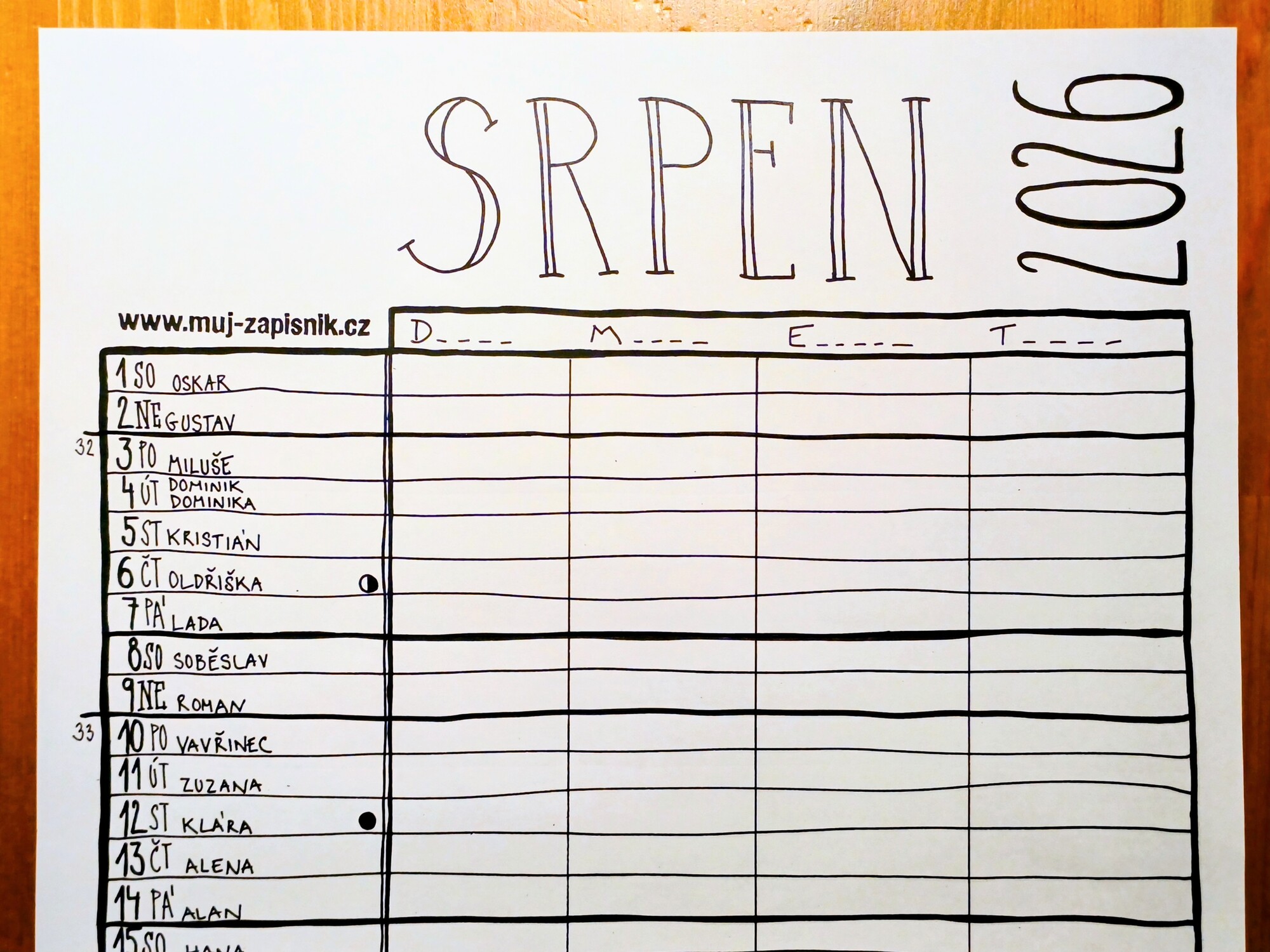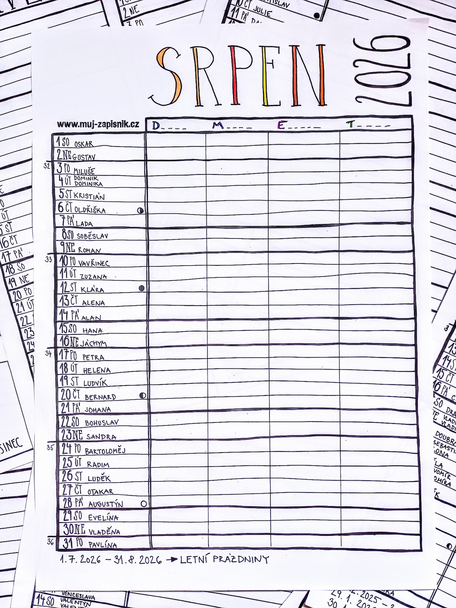 Plánovací kalendář 2026 z dílny Můj zápisník je autorský nástěnný kalendář, který je celý napsaný a nakreslený ručně. Obsahuje důležité informace jako jsou jmenné svátky, státní svátky, školní prázdniny nebo fáze měsíce a poskytne vám spousty prostoru pro zapsání všech důležitých událostí.