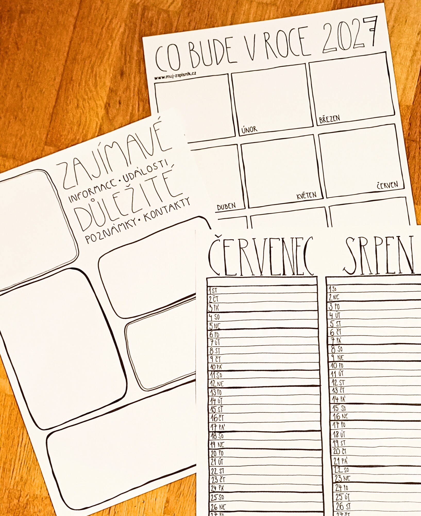 Opět je plánovací kalendář rozšířený o několik listů - samostatný list letní prázdniny, kde jsou letní měsíce pro přehlednost na jedné straně. Zůstává také přehledné plánování událostí na následující rok a list pro záznam důležitých informací, kterých není nikdy málo a je fajn je mít někde sjednocené na očích.