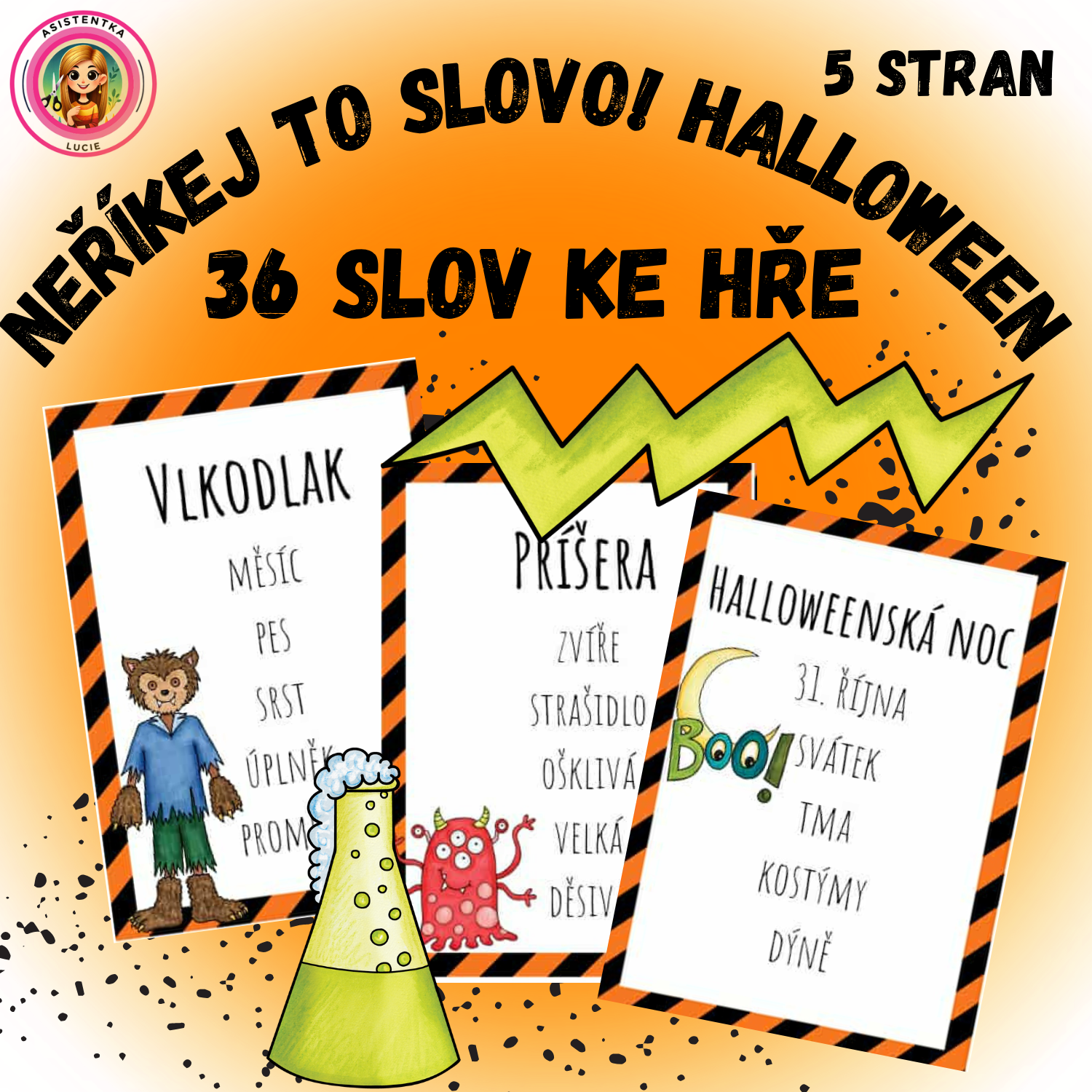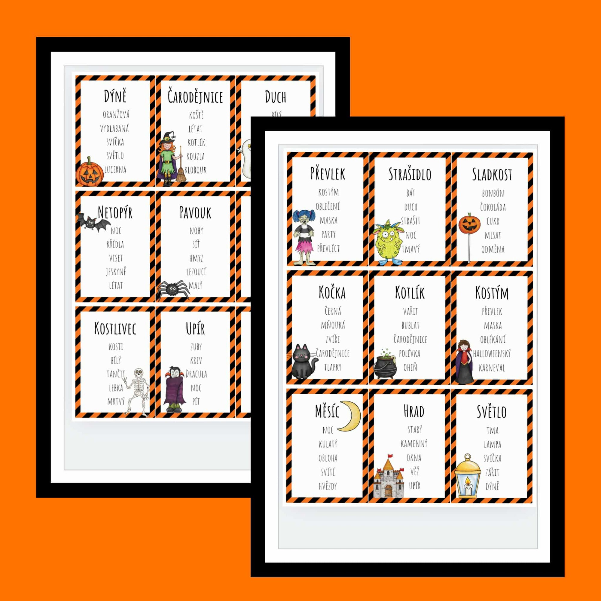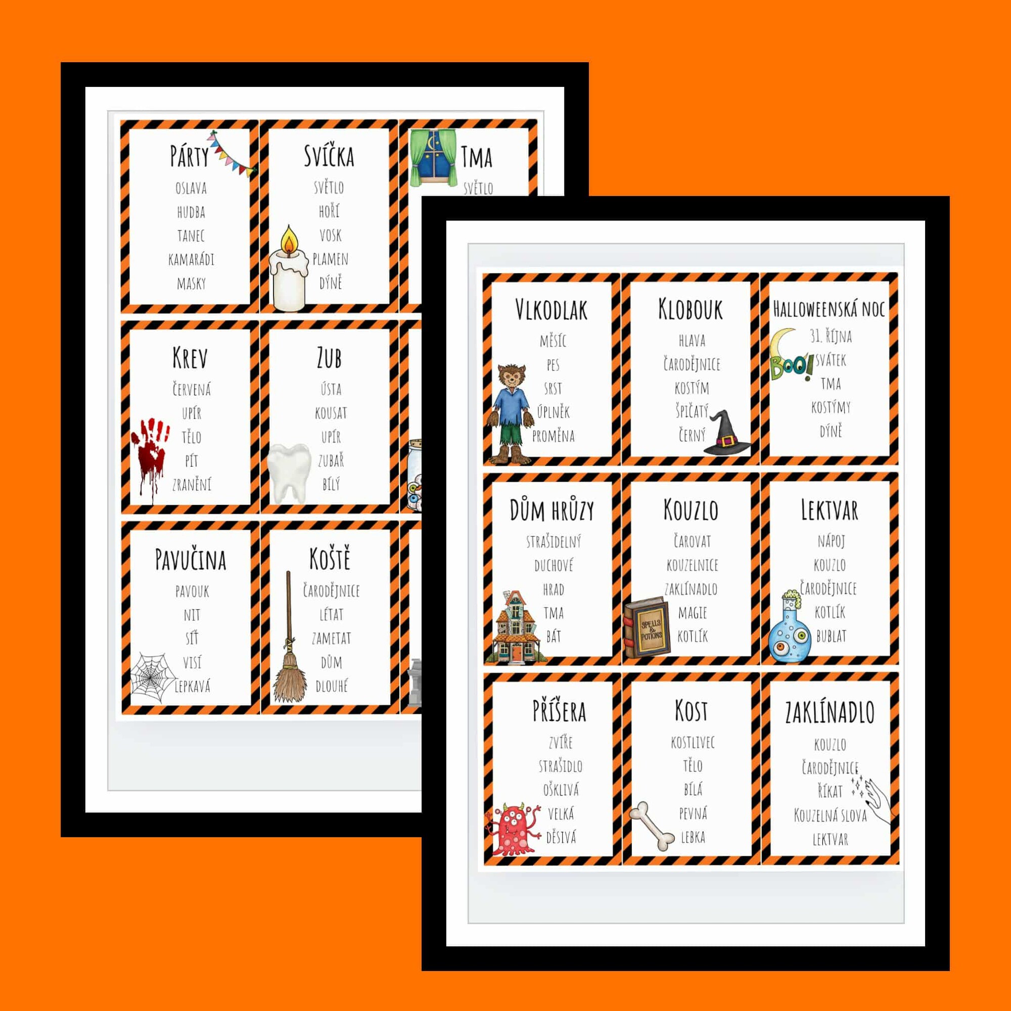 - 36 originálních halloweenských kartiček s hlavním slovem a pěti tabu výrazy, které se při popisu nesmí použít.