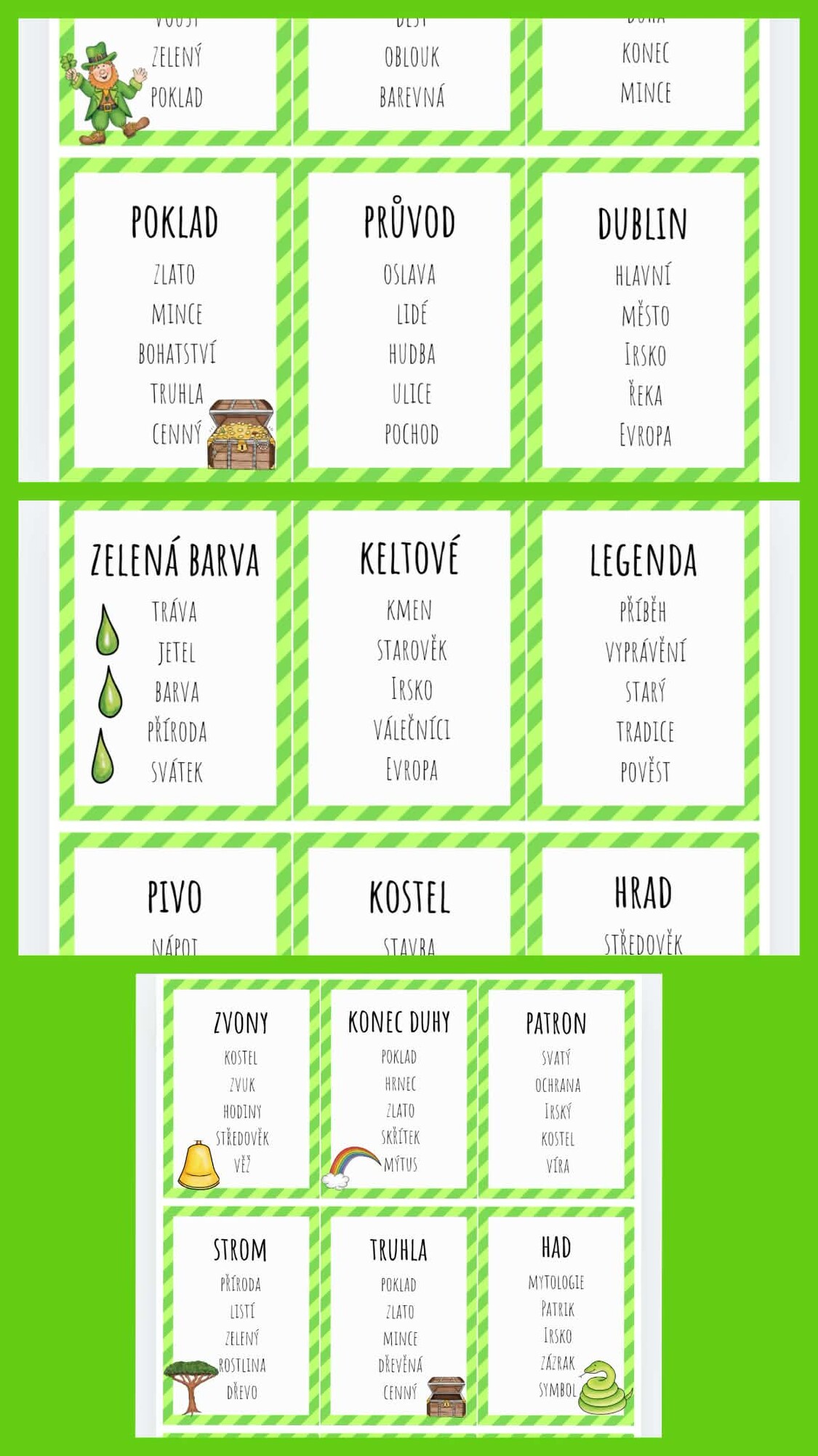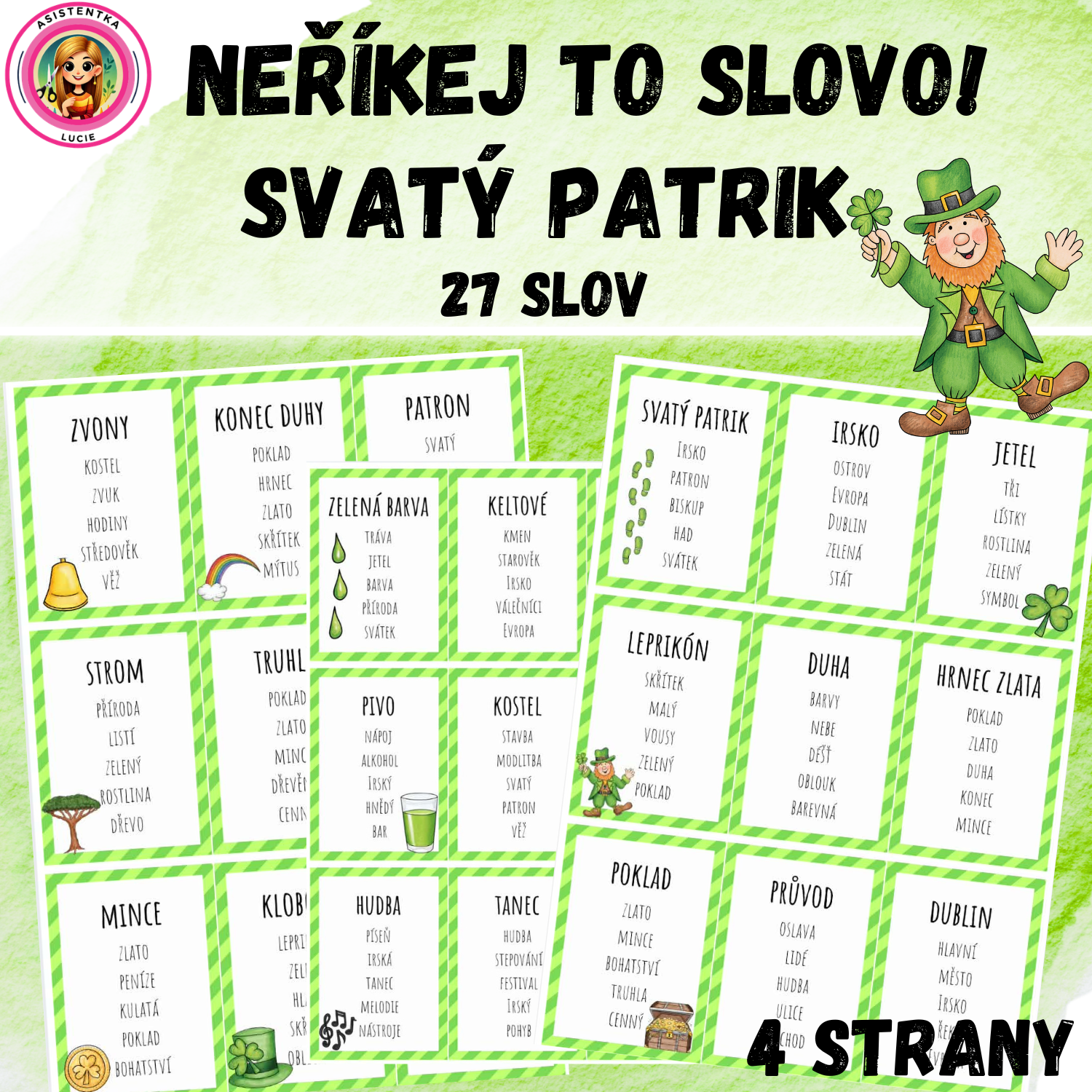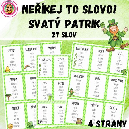 Tento materiál obsahuje 27 kartiček se slovy a zakázanými slovy pro oblíbenou komunikační hru „Neříkej to slovo!“. Aktivita je tematicky zaměřena na svátek svatého Patrika, irské tradice, legendy a symboly. Děti si během hry procvičují vyjadřování, slovní zásobu, schopnost popisovat a také spolupráci ve skupině.
