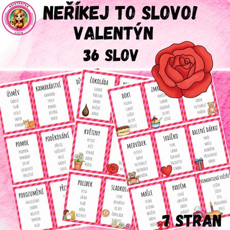 Tento materiál obsahuje 36 kartiček ke hře „Neříkej to slovo“ na téma Valentýn, láska a přátelství. Každá kartička obsahuje jedno hlavní slovo a pět zakázaných slov. Hra je vhodná pro práci ve třídě, skupinové aktivity nebo jako zábavná interaktivní hra při tématických dnech. Hráči si procvičí slovní zásobu, schopnost popisu, naslouchání a spolupráci, a zároveň si užijí spoustu legrace.