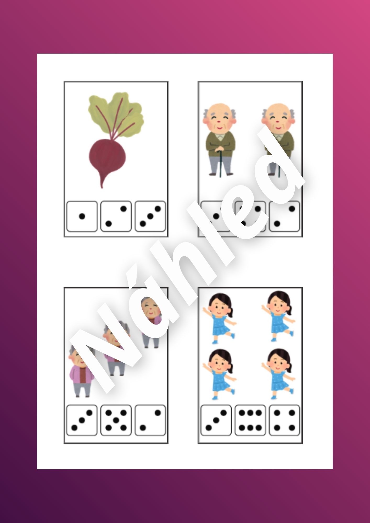 - Kolíčkování - počty - děti pomocí kolíčků označují správný počet podle počtu obrázků