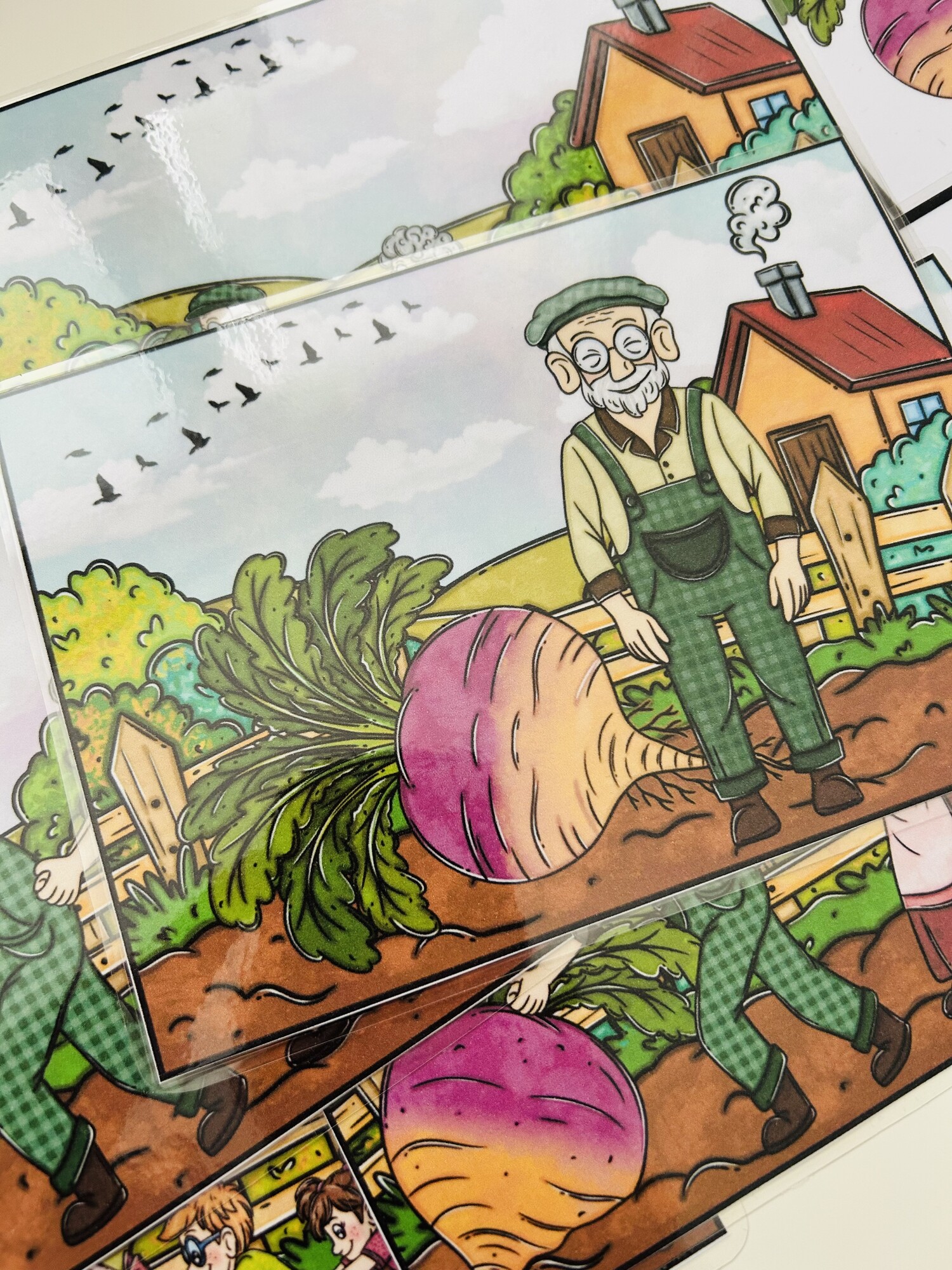 Kartičky s různými polohami řepy (v hlíně, za dědou, před babičkou, vpravo/vlevo…) rozvíjejí porozumění prostorovým pojmům a slovní zásobu.
