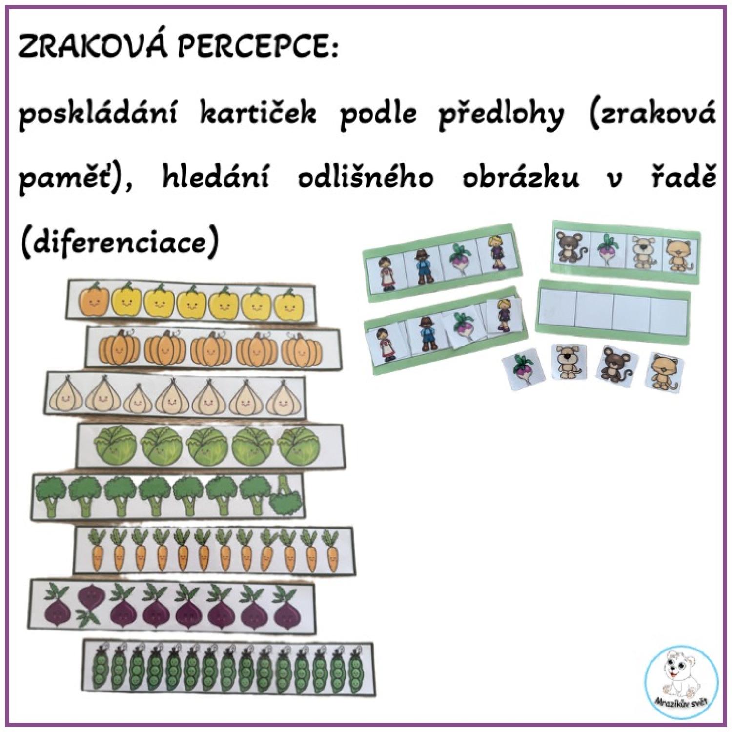 pojmenovávání zeleniny, určení odlišného obrázku v řadě (zraková diferenciace), volbou dítěte může být počítání obrázků na kartičkách (5-15)