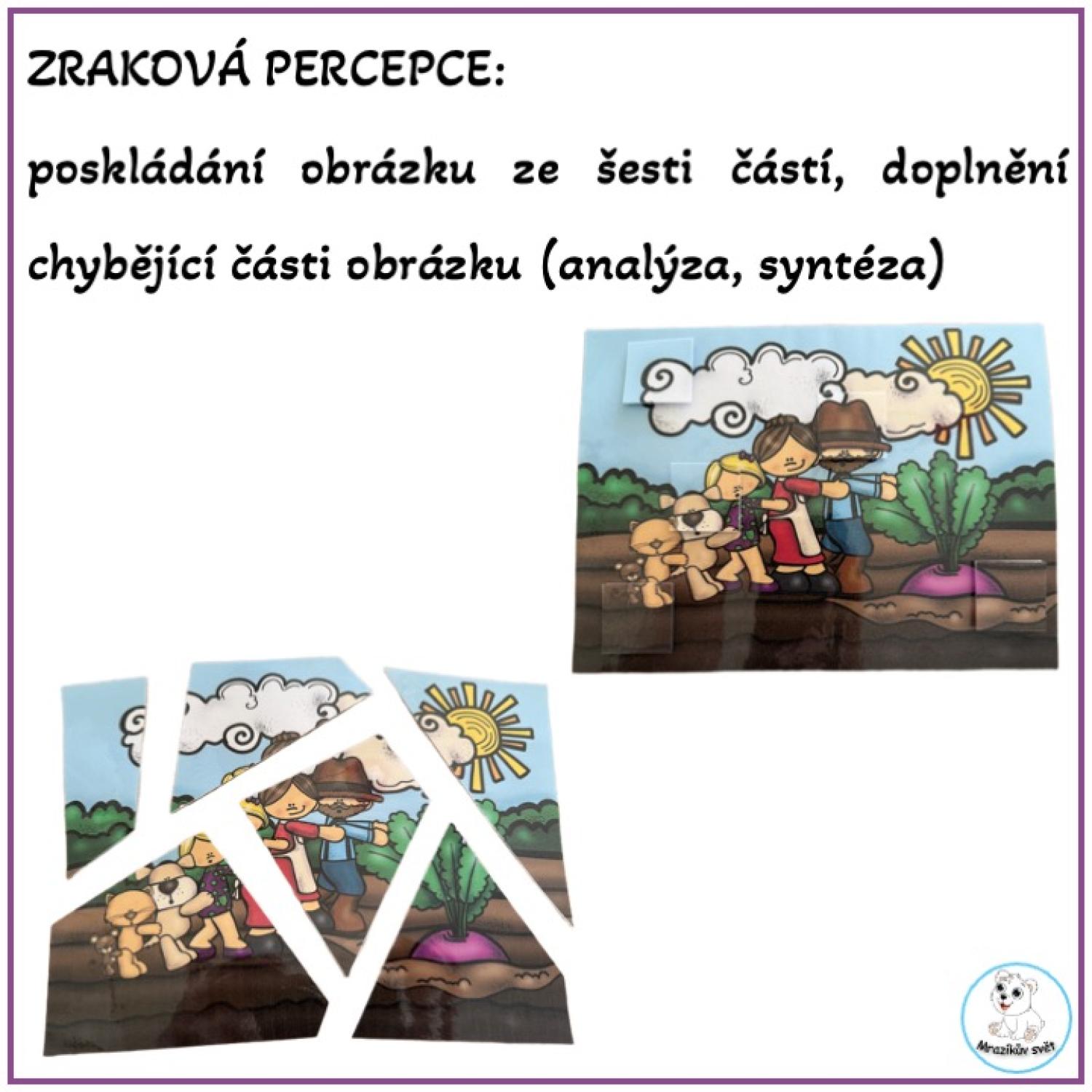 poskládání obrázku ze šesti částí, doplnění chybějící části do obrázku (zraková analýza a syntéza)