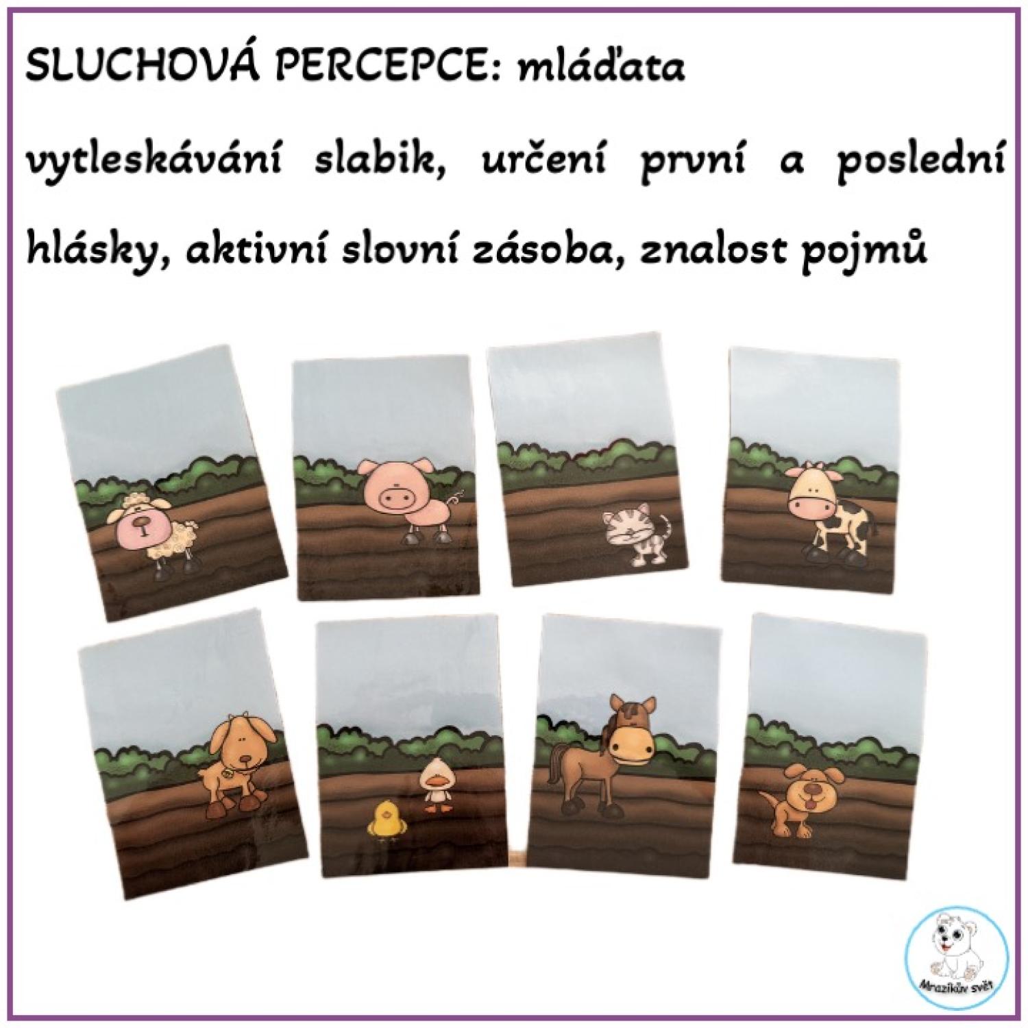 aktivní slovní zásoba, znalost pojmů (samec, samice, mládě), sluchová analýza a syntéza (první hláska, vytleskávání slabik)