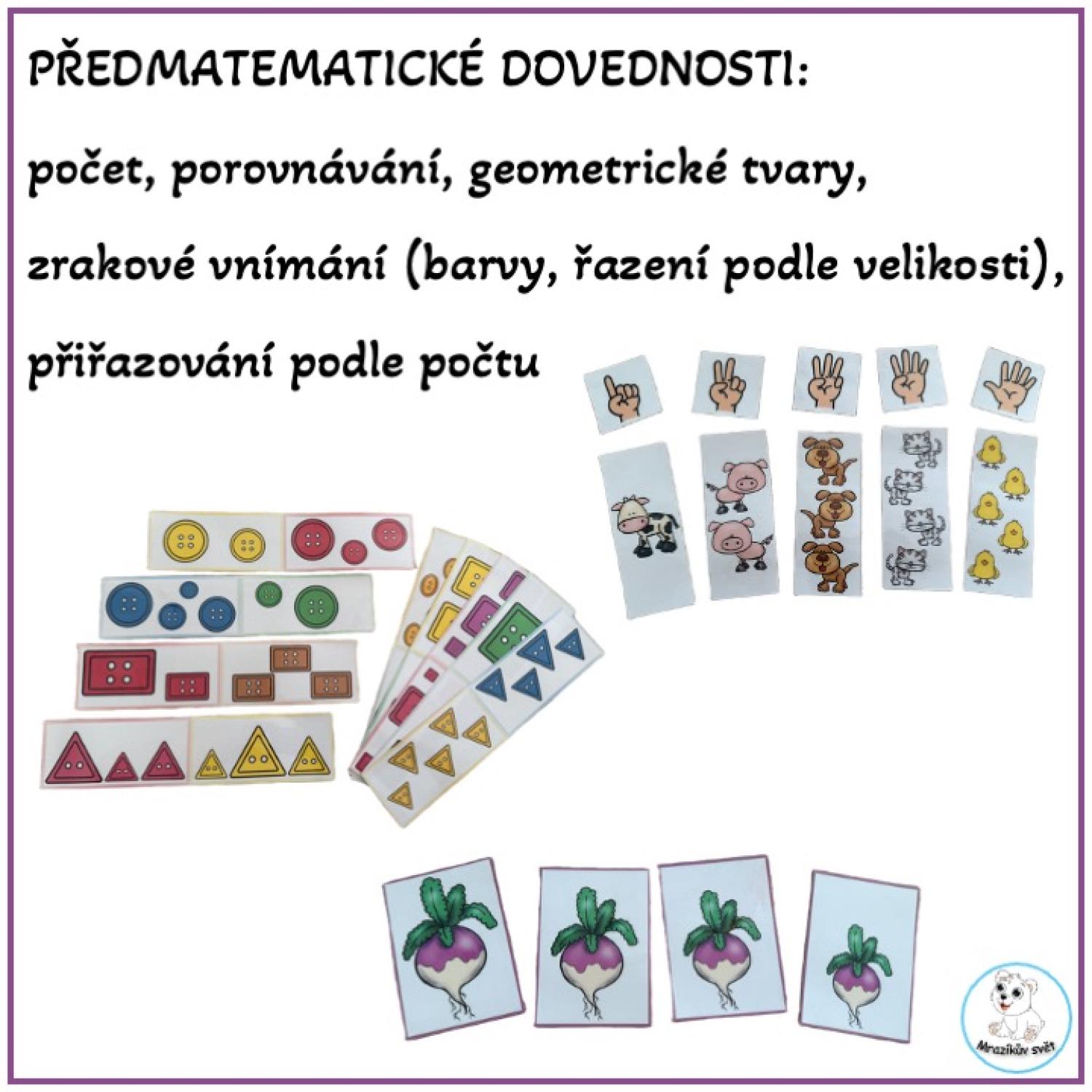 zrakové vnímání (barvy, velikost), předmatematické představy (počet, porovnávání, geometrické tvary)