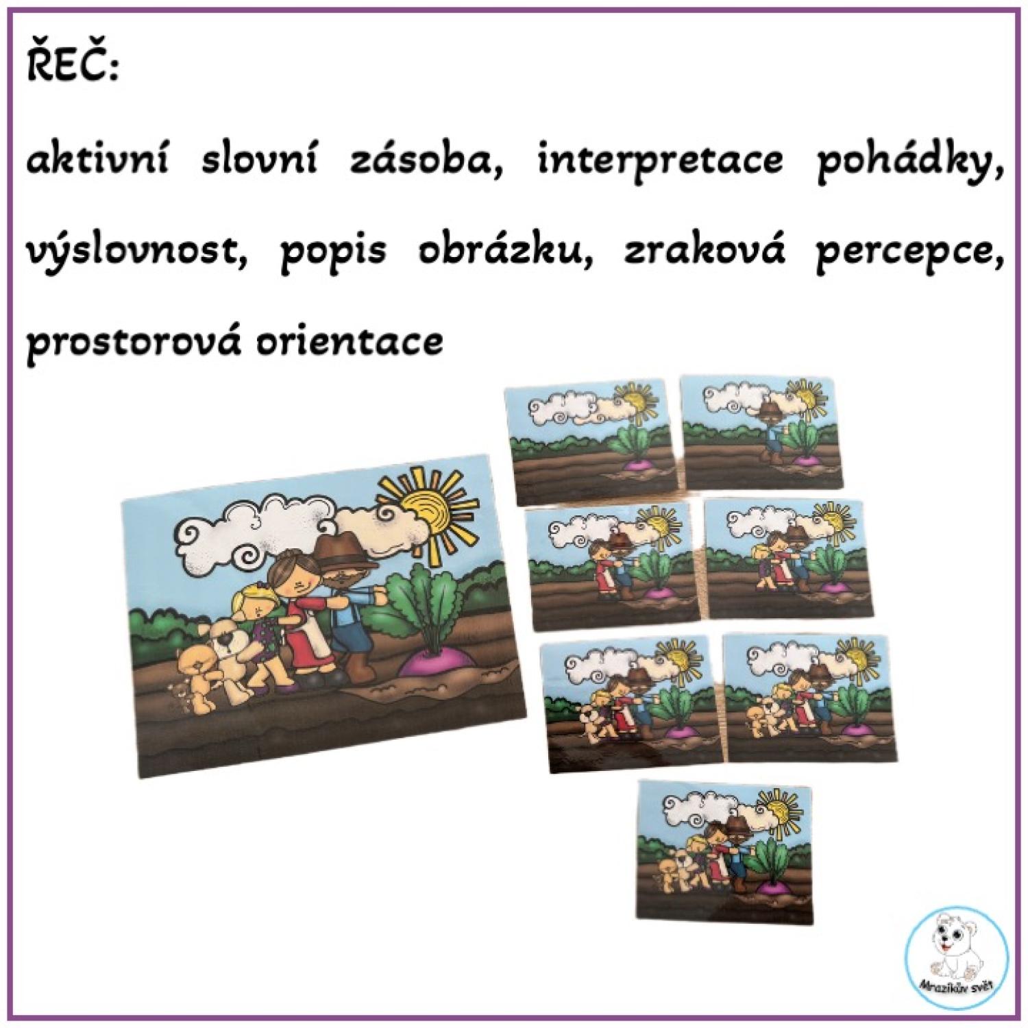 popis obrázku, interpretace pohádky, použití aktivní slovní zásoby, zrakové vnímání (figura a pozadí), prostorová orientace (první, třetí, poslední, vpravo, vlevo apod.)
