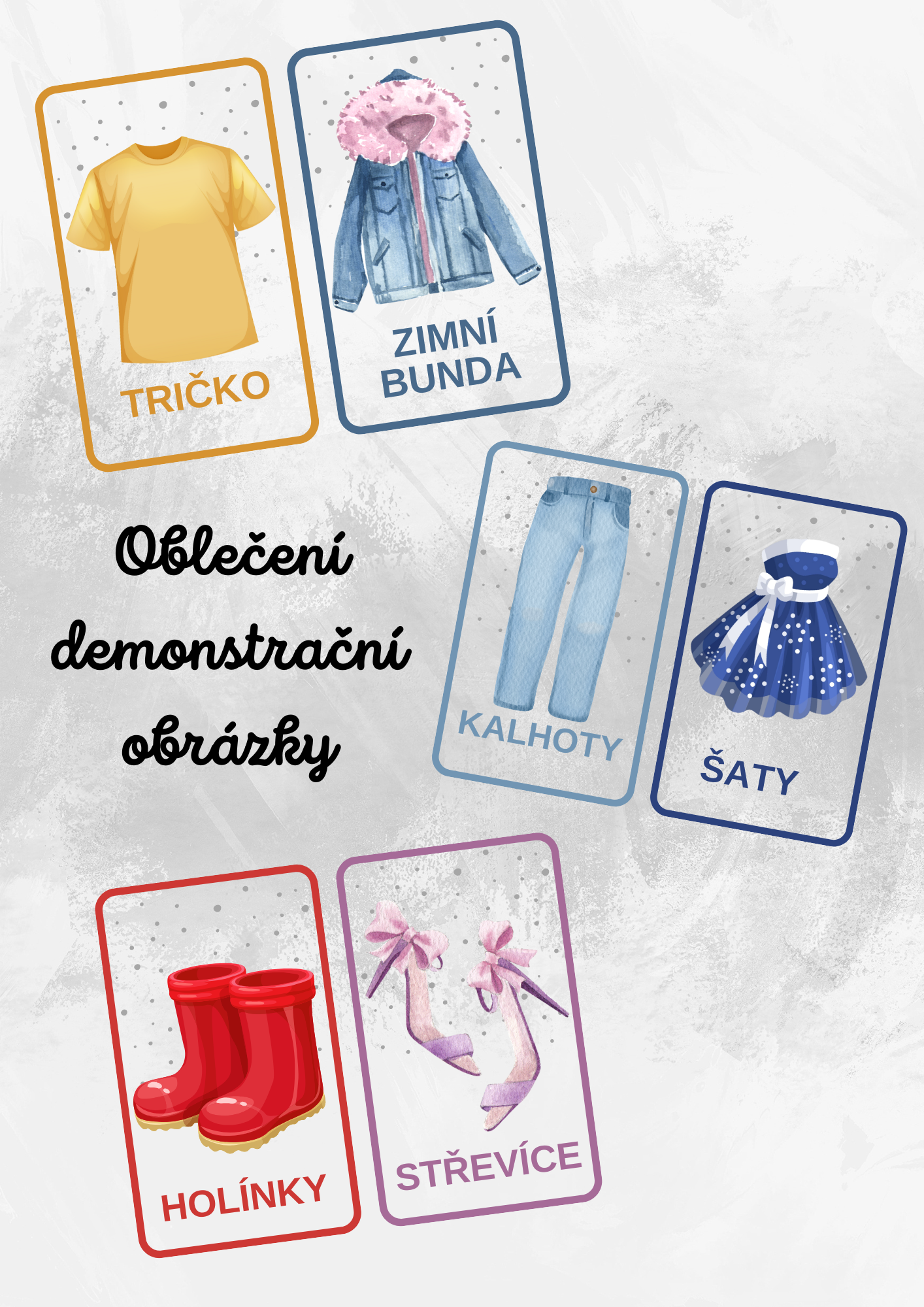 Tento soubor obsahuje 12 originálních, barevných demonstračních karet s motivy oblečení, které se skvěle hodí do výuky v mateřské i základní škole. Stačí je vytisknout, zalaminovat a můžete je okamžitě použít při práci s dětmi.