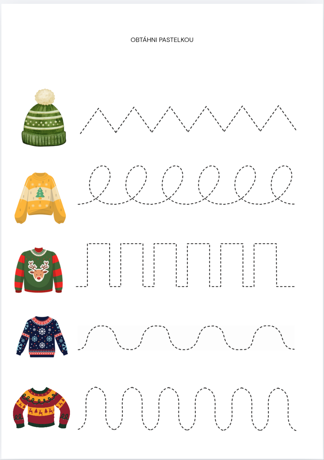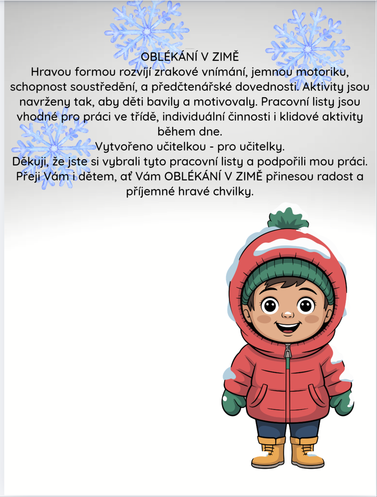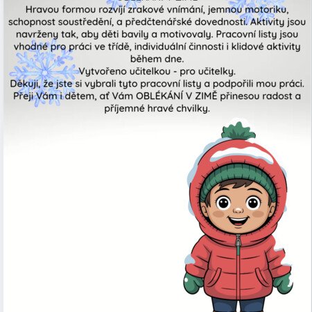 Tyto pracovní listy jsou vytvořeny pro děti v mateřské škole ve věku 4-5 let. Hravou formou rozvíjí zrakové vnímání, jemnou motoriku, schopnost soustředění, a předmatematické dovednosti. Aktivity jsou navrženy tak, aby děti bavily a motivovaly. Pracovní listy jsou vhodné pro práci ve třídě, individuální činnosti i klidové aktivity během dne. Vytvořeno učitelkou - pro učitelky. Děkuji, že jste si vybrali tyto pracovní listy a podpořili mou práci. Přeji Vám i dětem, ať Vám OBLÉKÁNÍ V ZIMĚ přinesou radost a příjemné hravé chvilky.