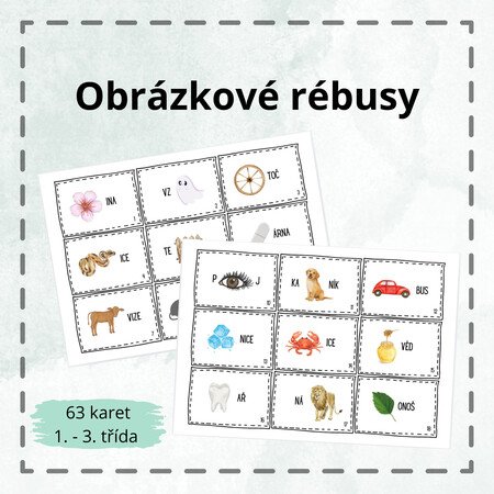 Materiál obsahuje celkem 63 kartiček obrázkových rébusů. Včetně řešení.