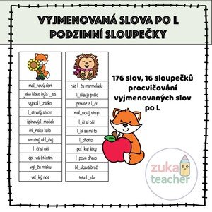 Materiál obsahuje 176 slovních spojení – 16 různých sloupečků na doplňování i/í, y/ý po vyjmenovaných slovech po L