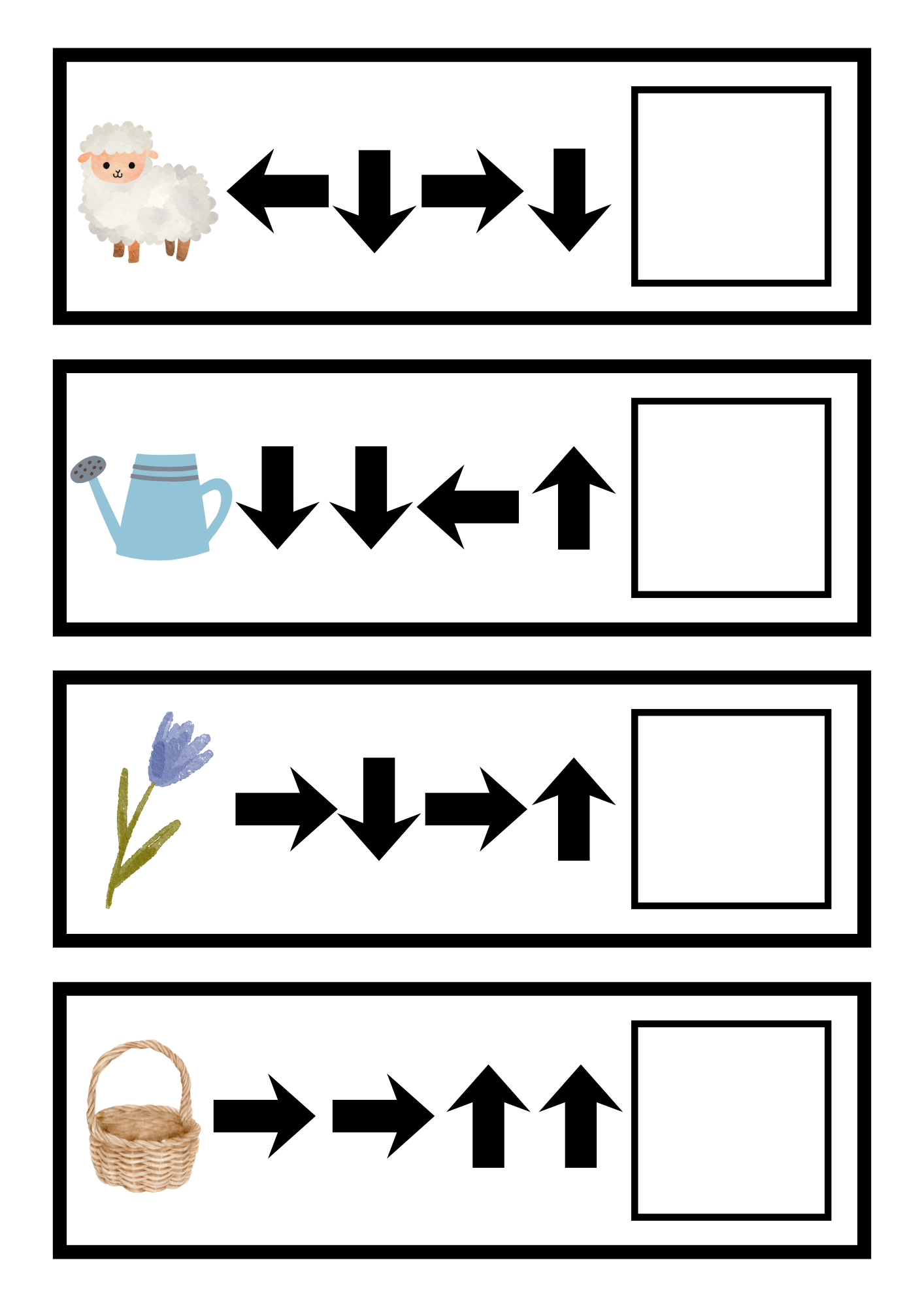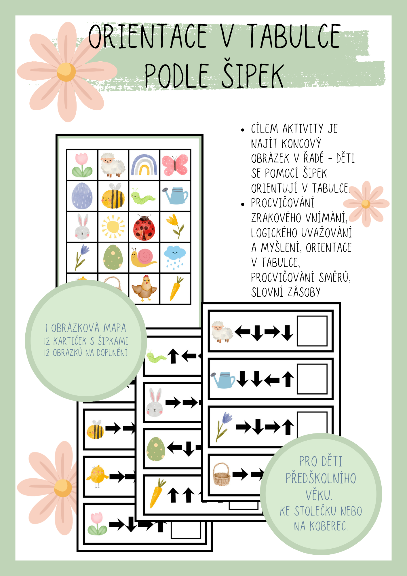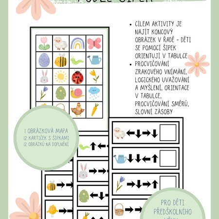 Dítě si vybere kartičku a snaží se doplnit cílový obrázek - snaží se orientovat v tabulce pomoci šipek.