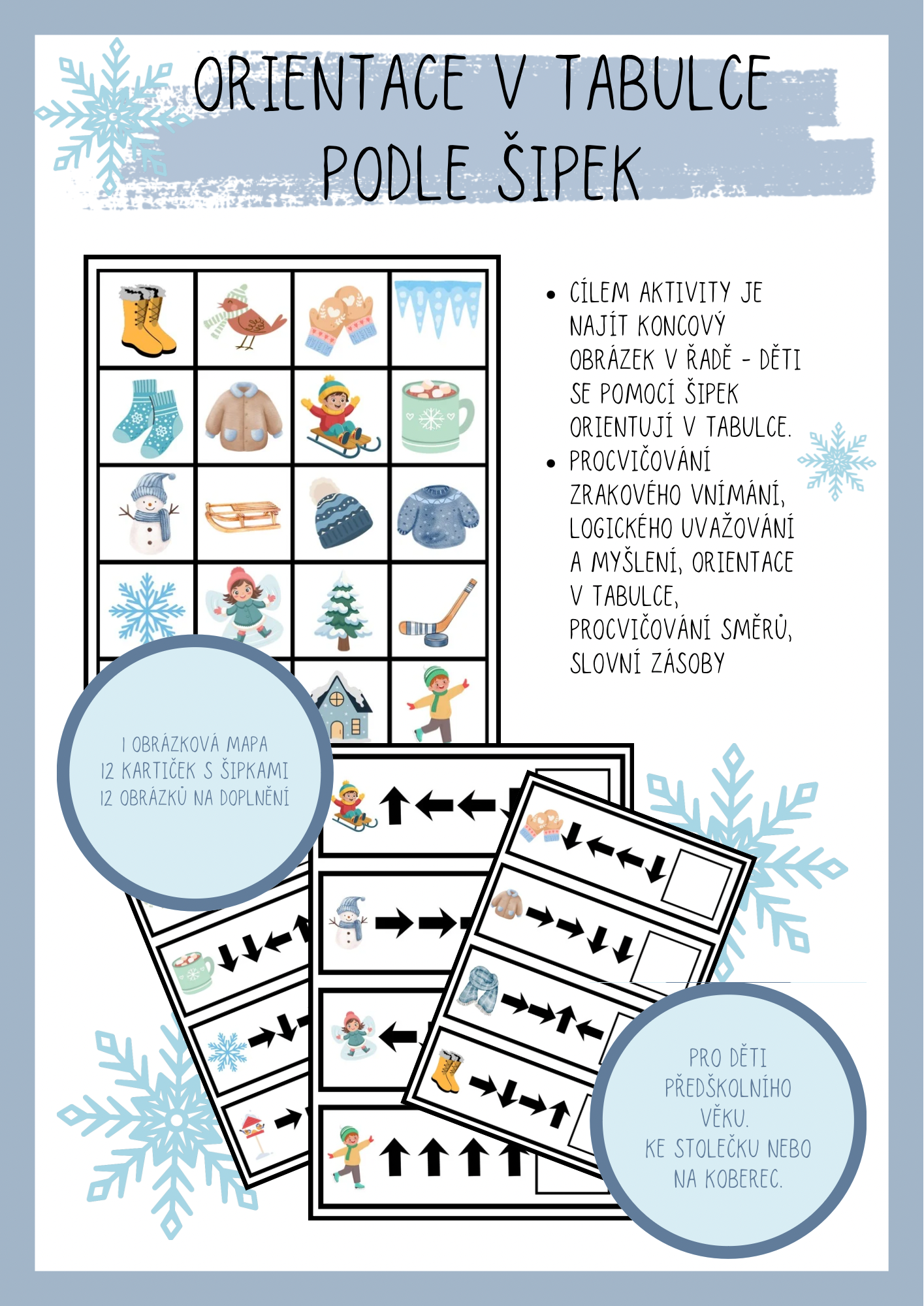 Dítě si vybere kartičku a snaží se doplnit cílový obrázek - snaží se orientovat v tabulce pomoci šipek.