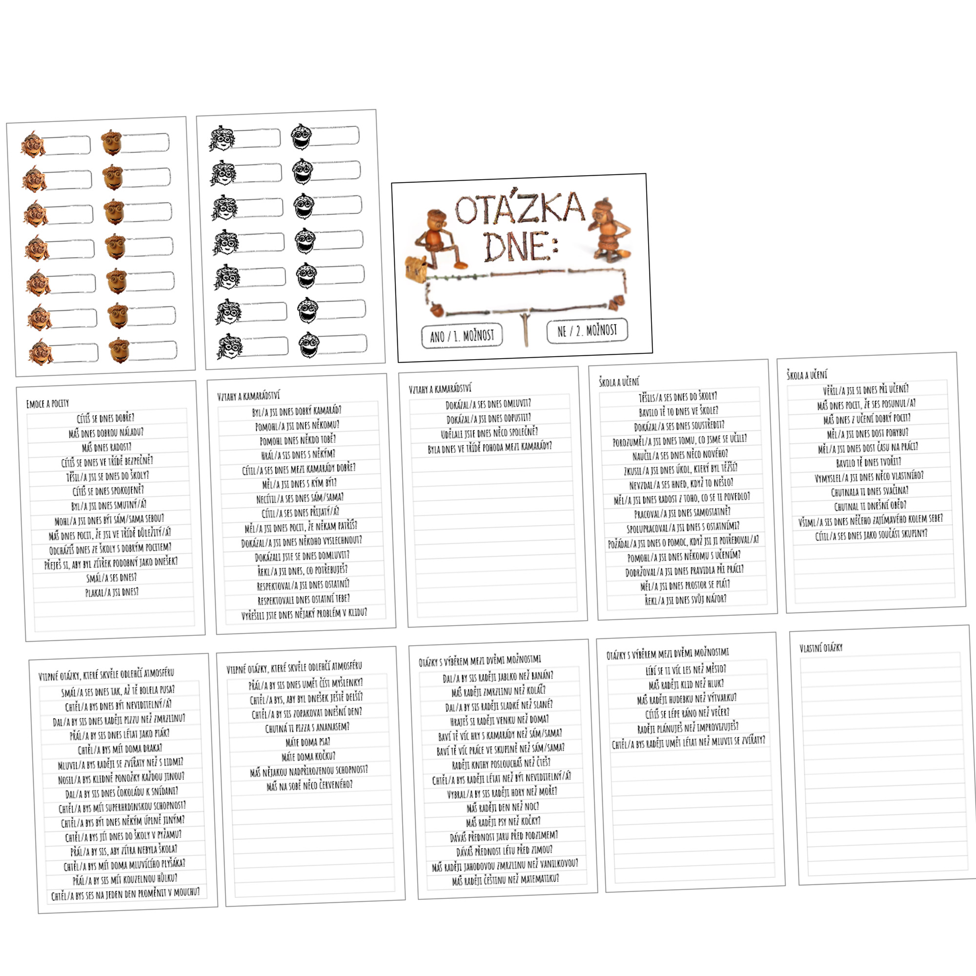 Každý den paní učitelka připne na plakát jednu z předpřipravených otázek a děti svou jmenovku umístí na stranu odpovědi, se kterou se ztotožňují – vlevo ANO (první možnost), vpravo NE (druhá možnost). Vše je jednoduché, přehledné a zvládnutelné i pro mladší děti. Balíček obsahuje předpřipravené otázky rozdělené do témat. Díky tomu lze otázky snadno střídat podle aktuální nálady ve třídě, ročního období nebo potřeb dětí. Otázky rozvíjejí schopnost sebereflexe, empatie a rozhodování, přirozeně otevírají prostor k rozhovoru – bez tlaku, hodnocení nebo „správných“ odpovědí. Děti mají pocit, že jejich hlas je slyšet, a učitel získává rychlou a nenásilnou zpětnou vazbu o klimatu ve třídě.