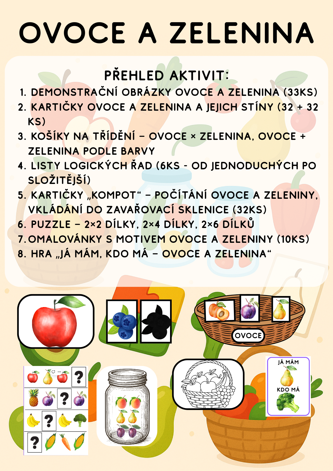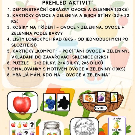 Obsahuje pestré aktivity, které podporují: rozvoj slovní zásoby a poznávání ovoce a zeleniny, třídění, logické myšlení a matematické představy, jemnou motoriku a grafomotoriku, Aktivity jsou navrženy tak, aby šly využívat různými způsoby a kombinovat mezi sebou.