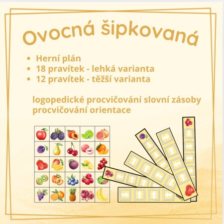 Hra pro malé děti rozvíjející slovní zásobu, logické myšlení a orientaci vpravo, vlevo, nahoře a dole. Obsahuje herní plán, 30 pravítek s úkoly ve dvou obtížnostech a klíč ke správnému řešení.procvičování slovní zásoby a orientaceCo hra rozvíjí?✅ Slovní zásobu a porozumění obrázkům✅ Orientaci vpravo, vlevo, nahoře a dole✅ Soustředění a logické myšlení✅ Samostatnou kontrolu díky klíči správných řešeníPro koho je určena?Pro děti předškolního věkuPro mladší školákyVhodná k logopedickým cvičením i domácímu procvičováníJak hra funguje?Dítě si vybere pravítko s úkolem a položí ho na herní plán.Na začátku pravítka je obrázek, od kterého se vychází.Podle šipek dítě postupuje na další obrázky (oči nebo prstík sledují cestu).Cílový obrázek si dítě zkontroluje podle přiloženého klíče.Obsah balení1 herní plán18 pravítek s lehčími úkoly (4 šipky)12 pravítek s těžšími úkoly (6 šipek)Klíč se správnými řešenímiVýhody materiáluJednoduché použití – dítě hraje samostatně nebo s doprovodemVariabilita – lehčí i těžší varianta úkolůZábavná forma učení – děti se učí hrou