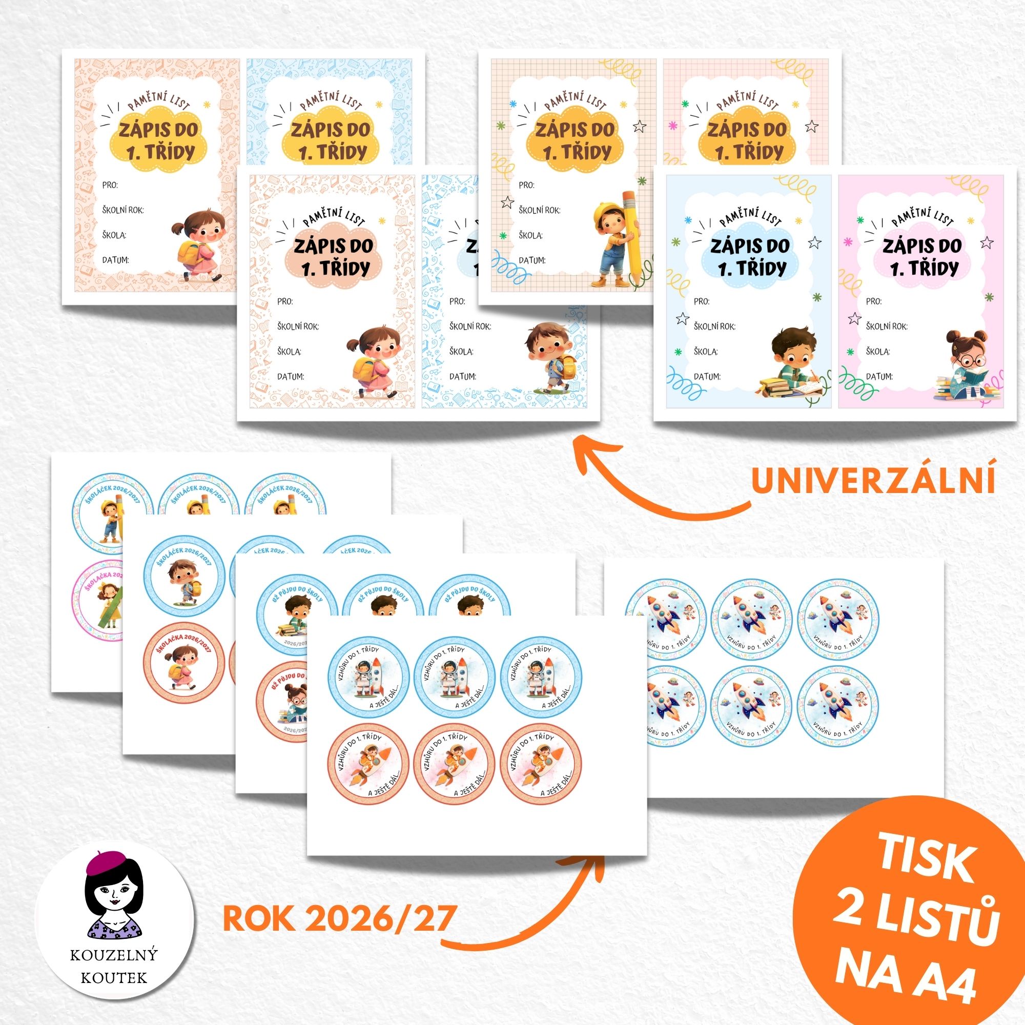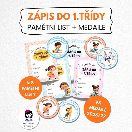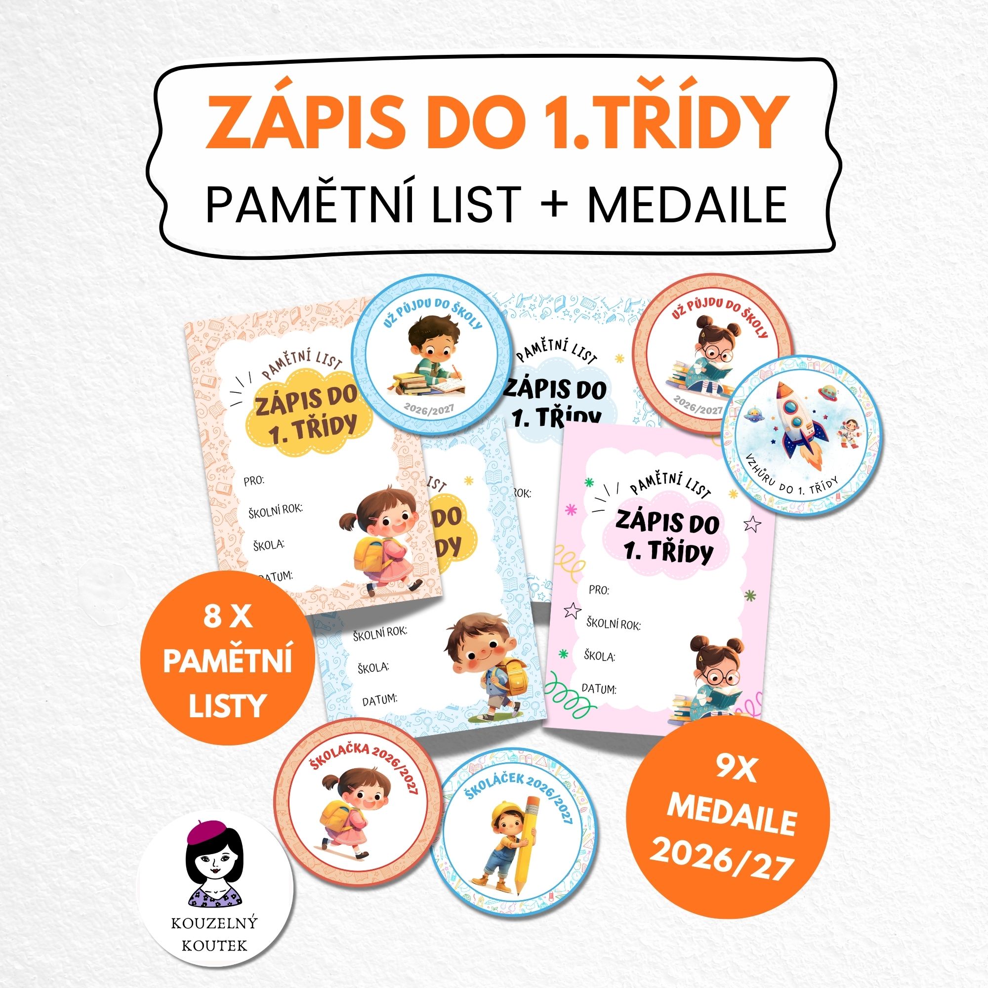 Set k vlastnímu vytištění k příležitosti zápisu do 1. třídy - pamětní listy jsou univerzální, medaile pro rok 2026/2027