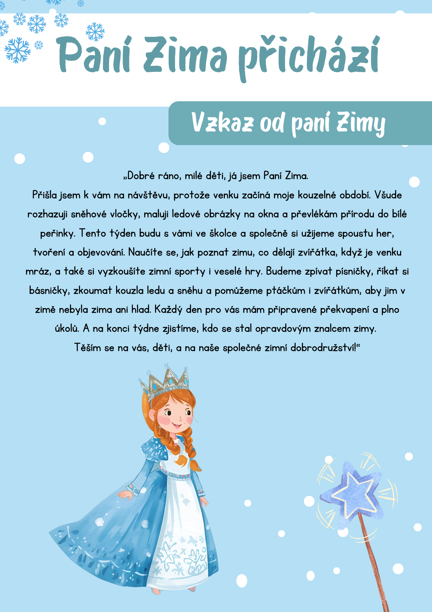 Děti provází kouzelná paní Zima, která je motivuje k objevování zimní přírody, radovánek, sportů i tradic. Soubor je rozdělený do pěti dnů a každý den nabízí jasně strukturované aktivity: