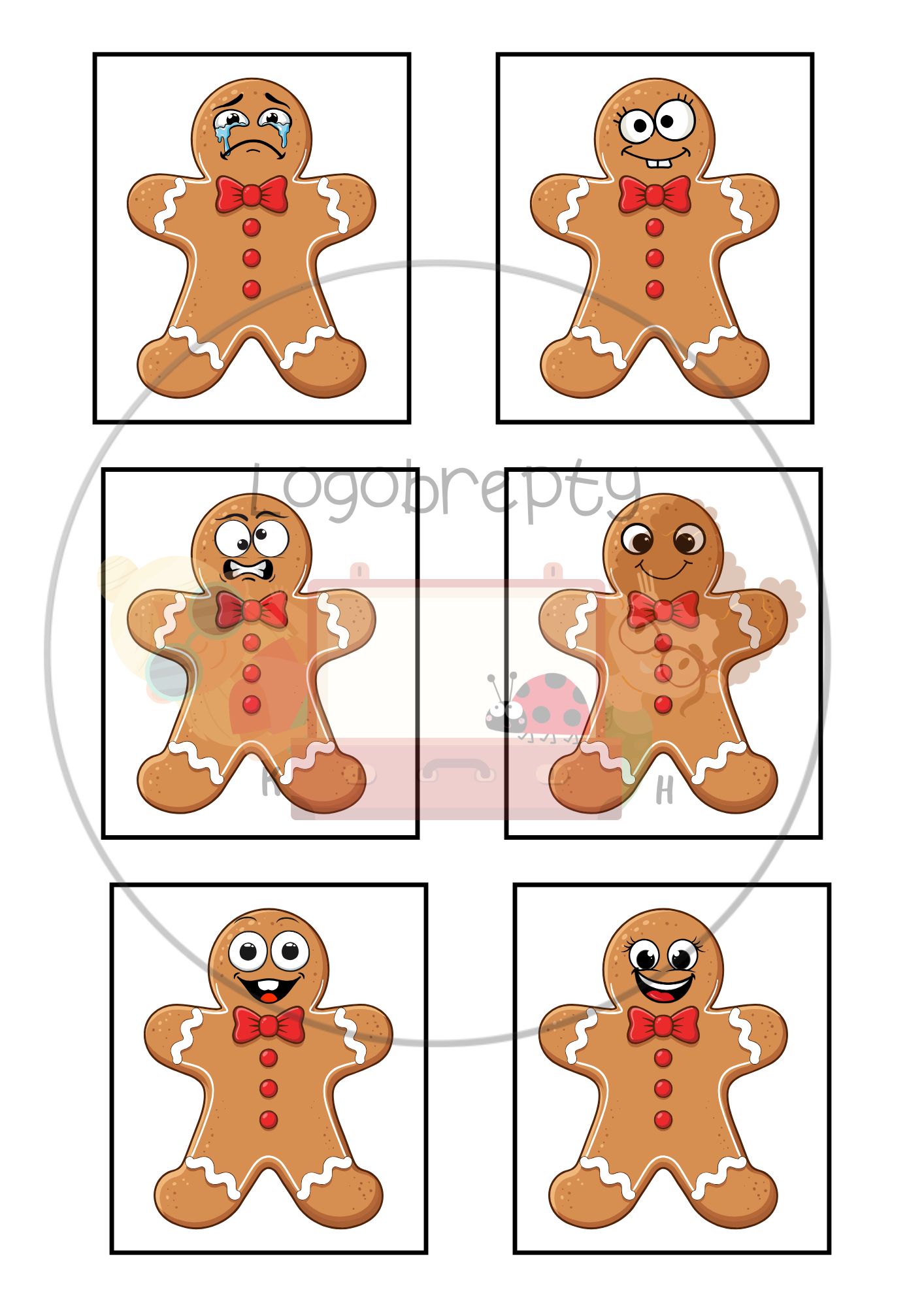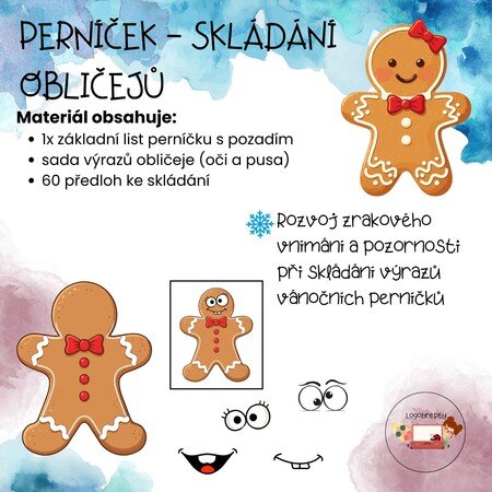 Děti si podle předlohy sestavují obličej perníčku a vybírají správný tvar očí a úst. Hravou formou tak trénují porovnávání detailů, pozornost i zrakové vnímání. Aktivitu můžeš obohatit o povídání o emocích, vymýšlení krátkých příběhů nebo sdílení vlastních prožitků – pomůcka tak získává i silný rozměr rozvoje emoční gramotnosti.
