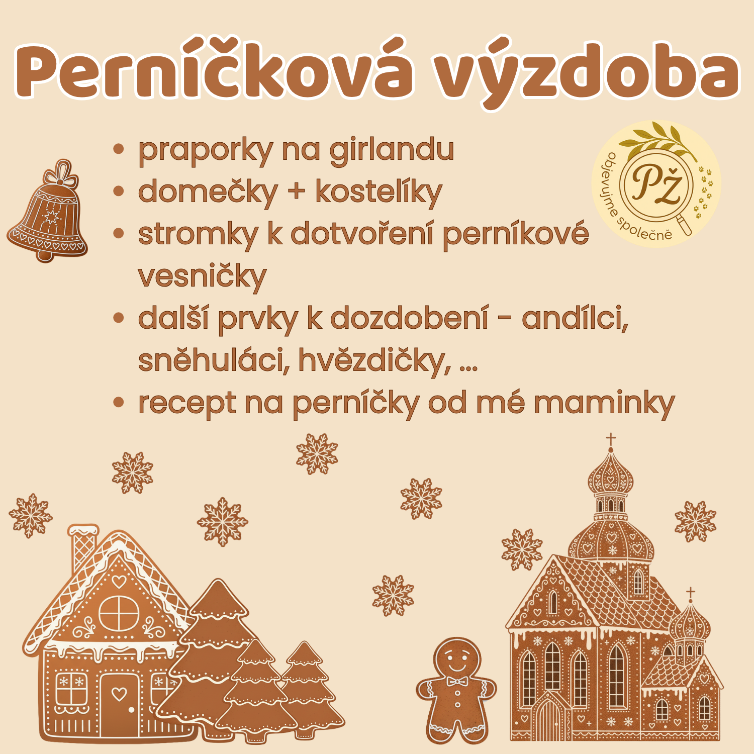 Nabízím soubor Perníčková výzdoba - vesničky. Vhodný k vytvoření výzdoby třídy, chodby, oken, případně při tvorbě jmenovek a přáníček, možno přilepit i na zabalené dárky apod.