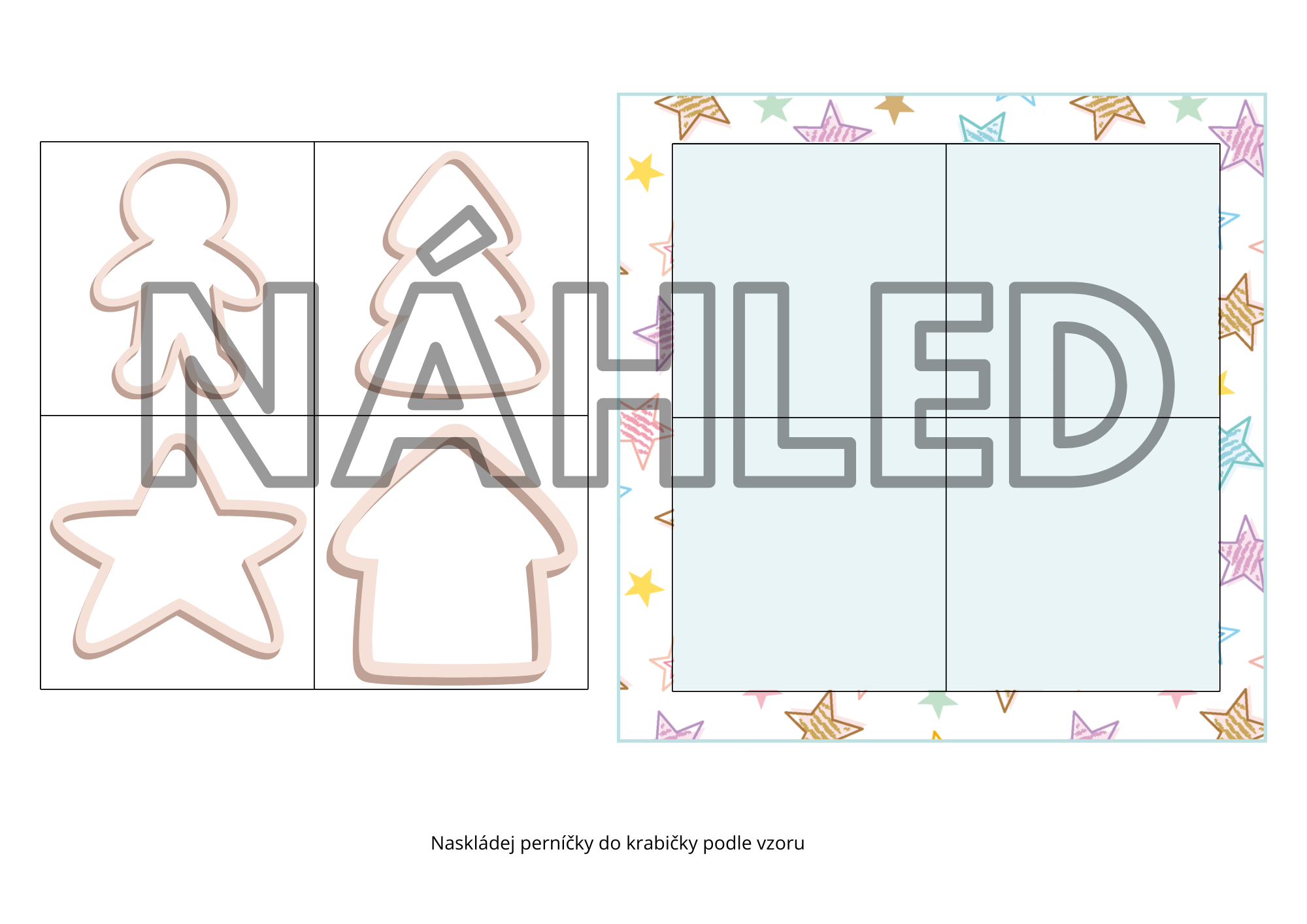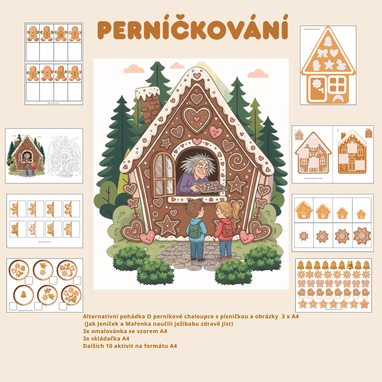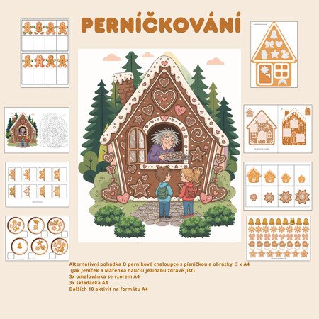 Tento soubor obsahuje alternativní pohádku O perníkové chaloupce s písničkou, demonstračními obrázky, omalovánkami a skládačkami. Dále 10 aktivit na rozvoj zrakového vnímání, základních matematických představ a orientace na ploše. Demonstrační obrázky k pohádce lze využít k procvičení dějové posloupnosti a k vyprávění pohádky dětmi - rozvoj komunikačních dovedností. Pohádka také rozvíjí fantazii, písnička sluchové vnímání a zpěv.