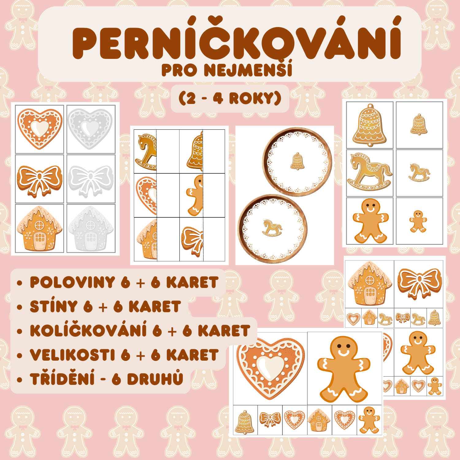 Soubor je zpracován pro malé děti 2 - 4 roky. Úkoly jsou jednoduché, obrázky velké. Soubor obsahuje: doplňování polovin 6 + 6 karet, stíny 6 + 6 karet, porovnávání velikostí malé x velké 6 + 6 karet, kolíčkování ve dvou formátech 6 karet A5 pro frontálně organizované činnosti. (magnetická tabule - označování magnetem), A6 klasické použití. Pro třídění je připraveno 6 podnosů a 48 kartiček.
