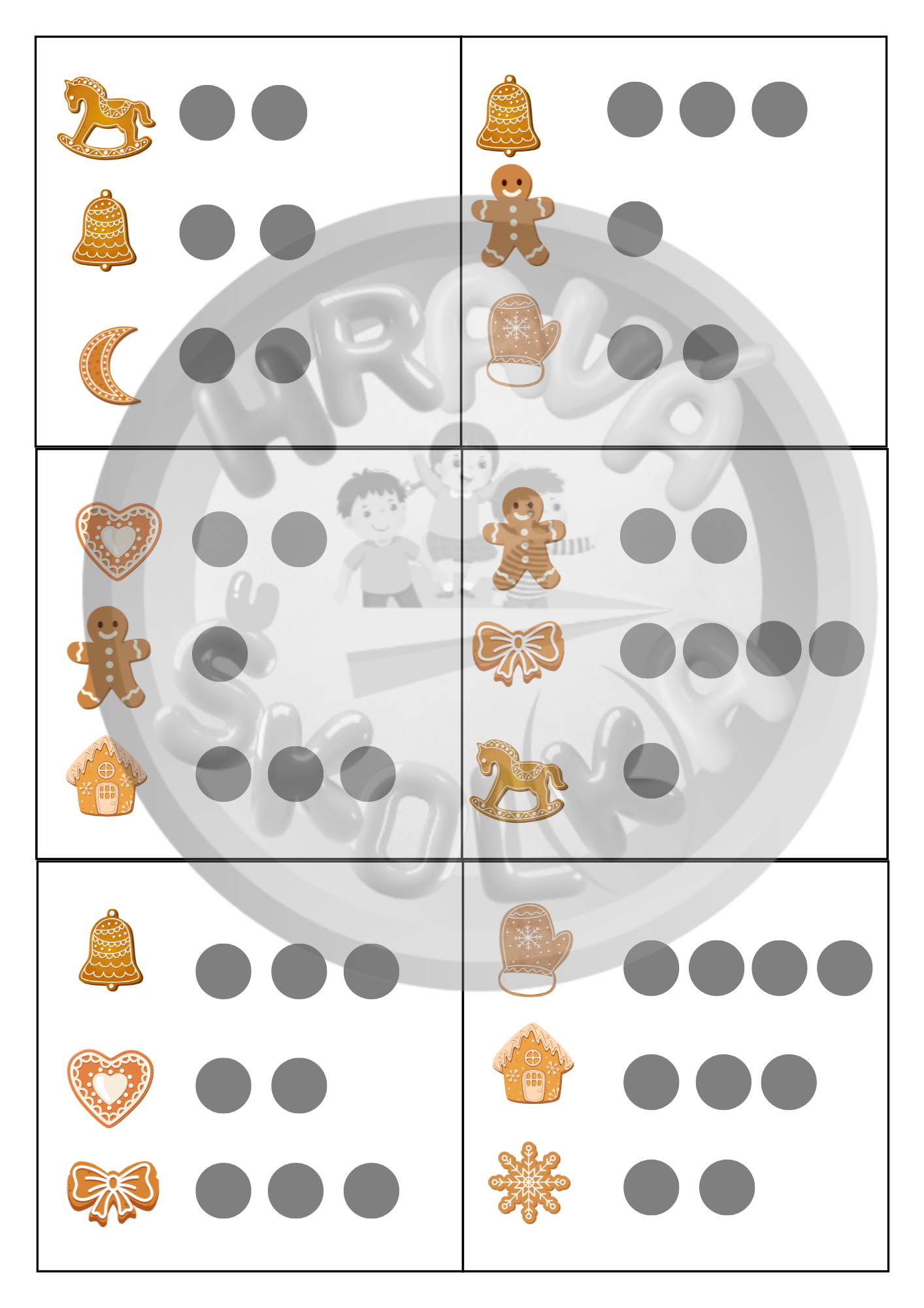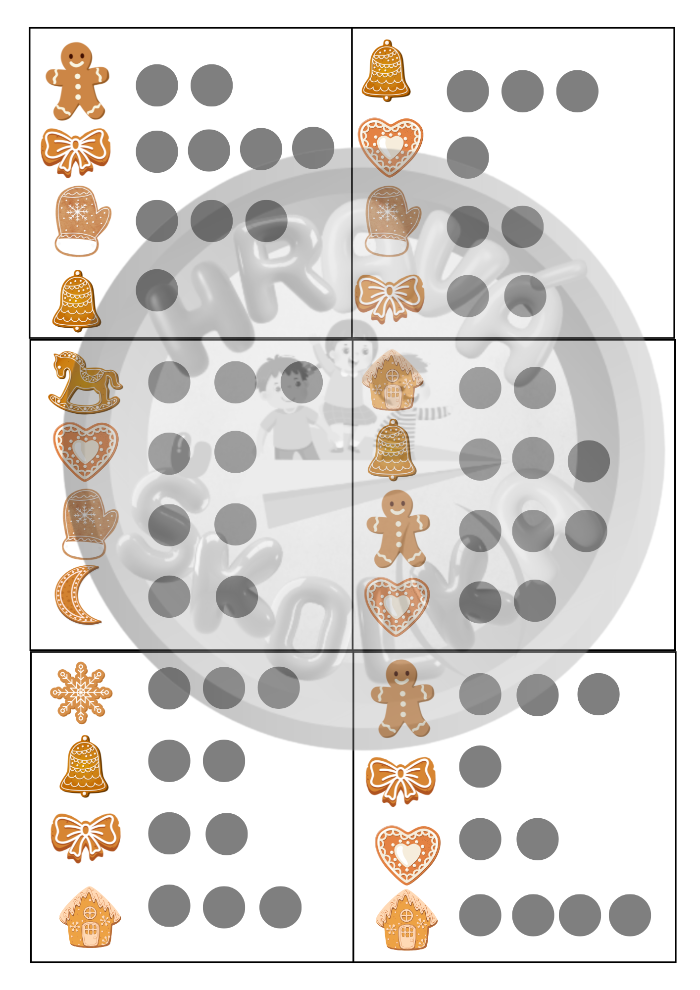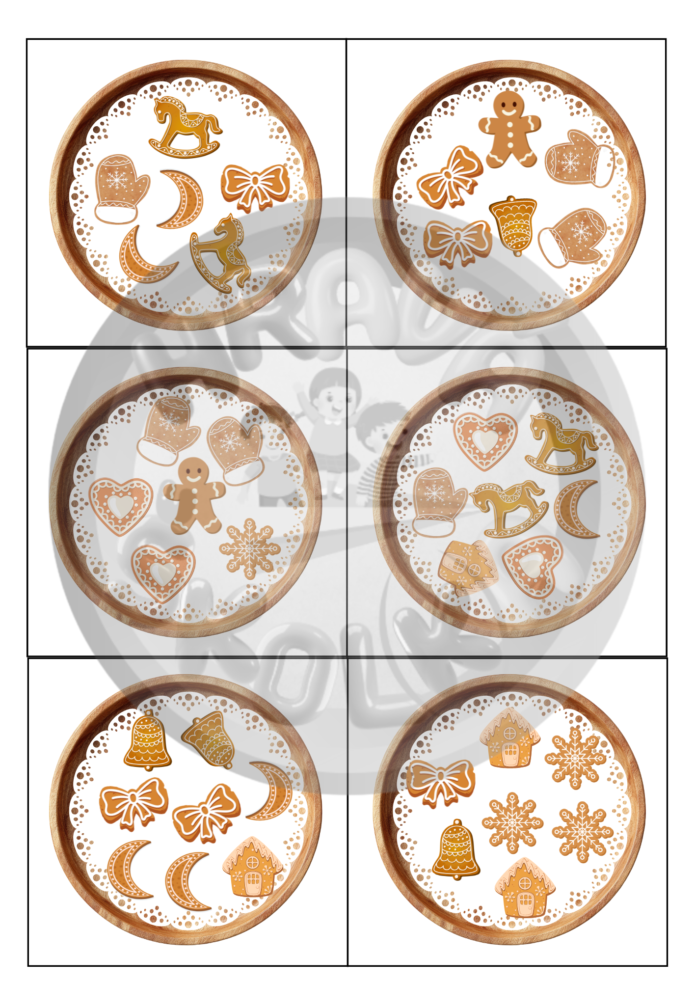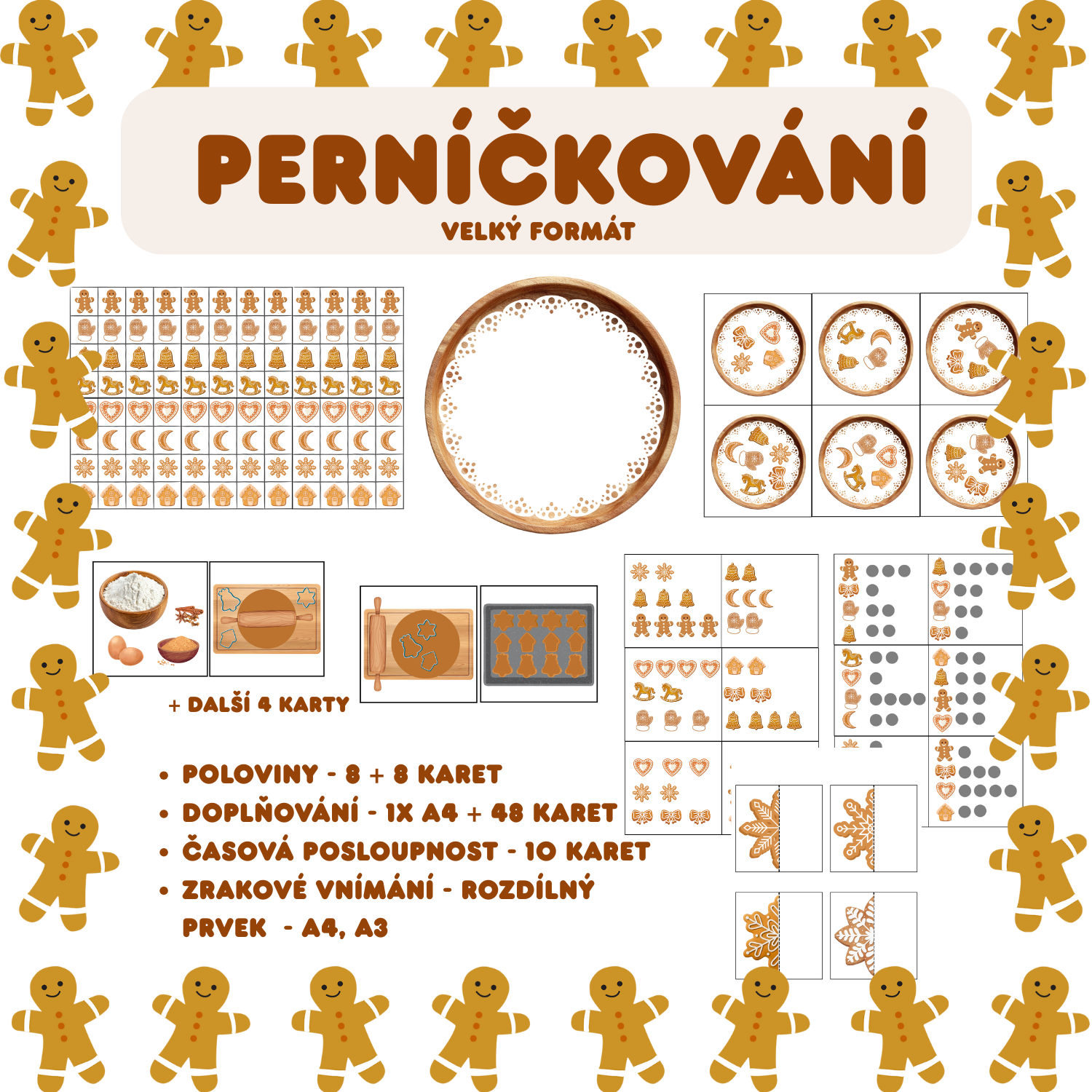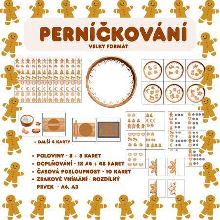 Soubor obsahuje: doplňování polovin obrázků 8 + 8 karet (zrakové vnímání a pozornost), doplňování podle vzoru 1x A4 + 48 karet se zadáním (4 obtížnosti vždy po 12ti kartách - základní matematické představy), vyhledávání rozdílného tvaru v řadě 1x A4, 1x A3 (zrakové vnímání a pozornost), časová posloupnost 10 karet (orientace v čase).