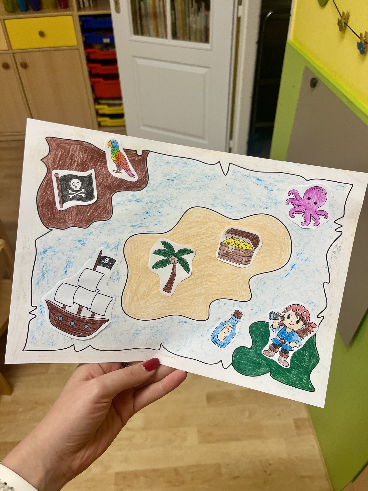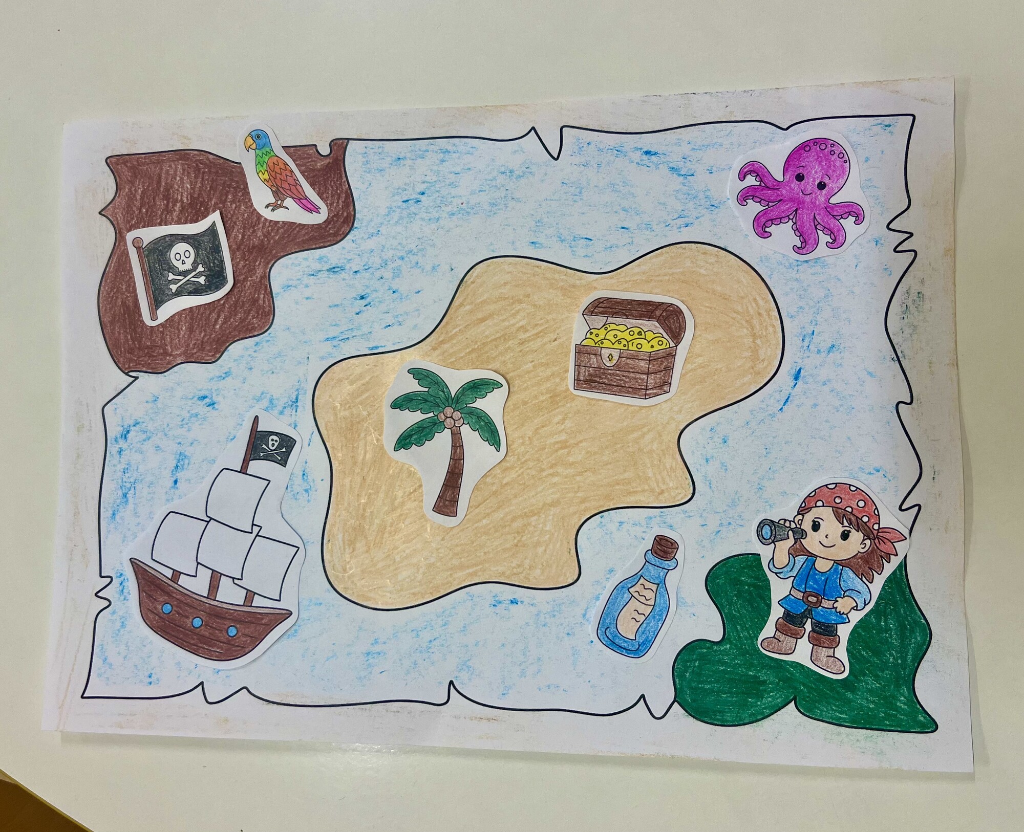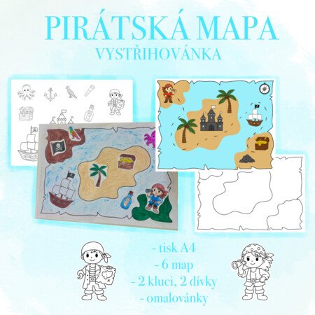Děti si mohou vytvořit a dozdobit vlastní pirátské mapy. Starší děti si mohou vytvořit své pirátské postavy a pirátské věci, které si mohou do mapy nalepit. Mladším děti mohou posloužit dané obrázky, které si vybarví a nalepí do mapy.