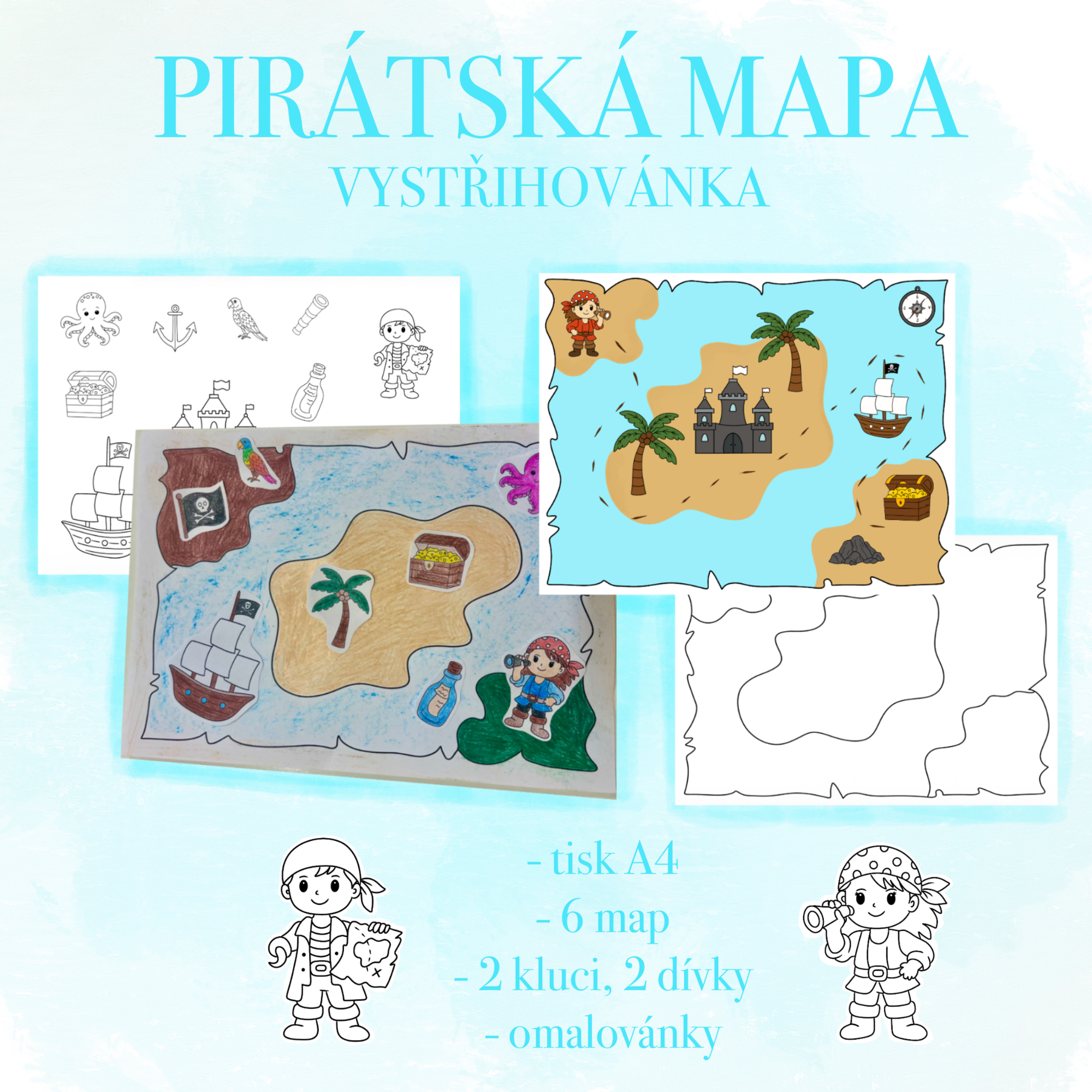 - 4 stránky s piráty a pirátskými obrázky (2 varianty dívek, 2 varianty chlapců)