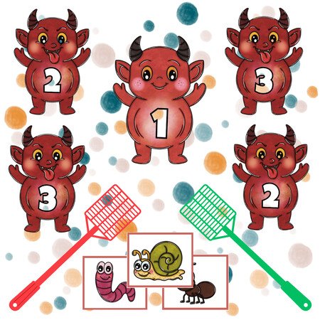 Čerti se rozmístí po koberci, lavici nebo jiné ploše. Každé dítě dostane plácačku na mouchy a úkol je jasný: co nejrychleji najít a PLÁCNOUT správného čerta podle právě otočeného zadání. Kdo zasáhne správně jako první, získává kartičku.