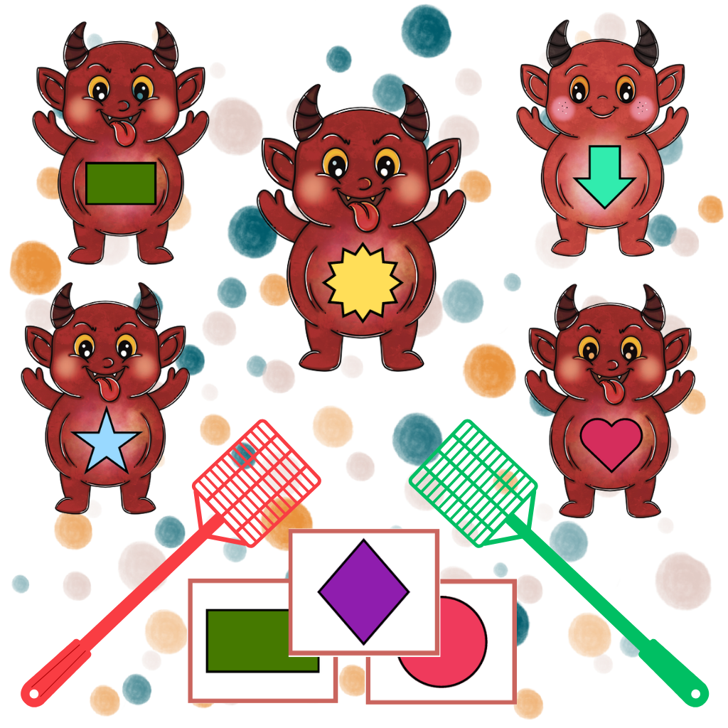 Čerti se rozmístí po koberci, lavici nebo jiné ploše. Každé dítě dostane plácačku na mouchy a úkol je jasný: co nejrychleji najít a PLÁCNOUT správného čerta podle právě otočeného zadání. Kdo zasáhne správně jako první, získává kartičku.