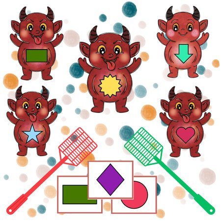 Plácni čerta je hravá aktivita, která dětem pomáhá zábavnou formou procvičit rozpoznávání tvarů a barev. Materiál obsahuje celkem 60 kartiček – 30 kartiček se zadáním (barevný tvar) a 30 čertů, kteří daný tvar a barvu znázorňují.