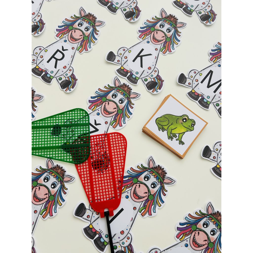 Plácni kobylu je hravá aktivita, která dětem pomáhá zábavnou formou procvičit počáteční hlásky. Materiál obsahuje celkem 56 kartiček – 28 kartiček se zadáním (barevné obrázky) a 28 kobyl, které znázorňují počáteční hlásky.